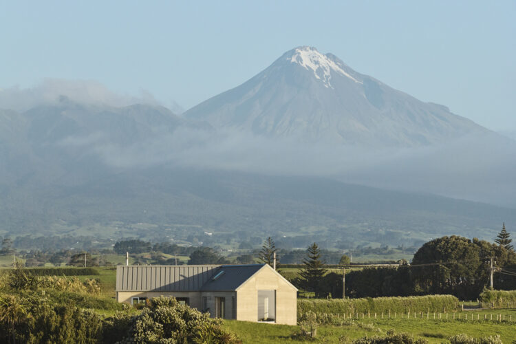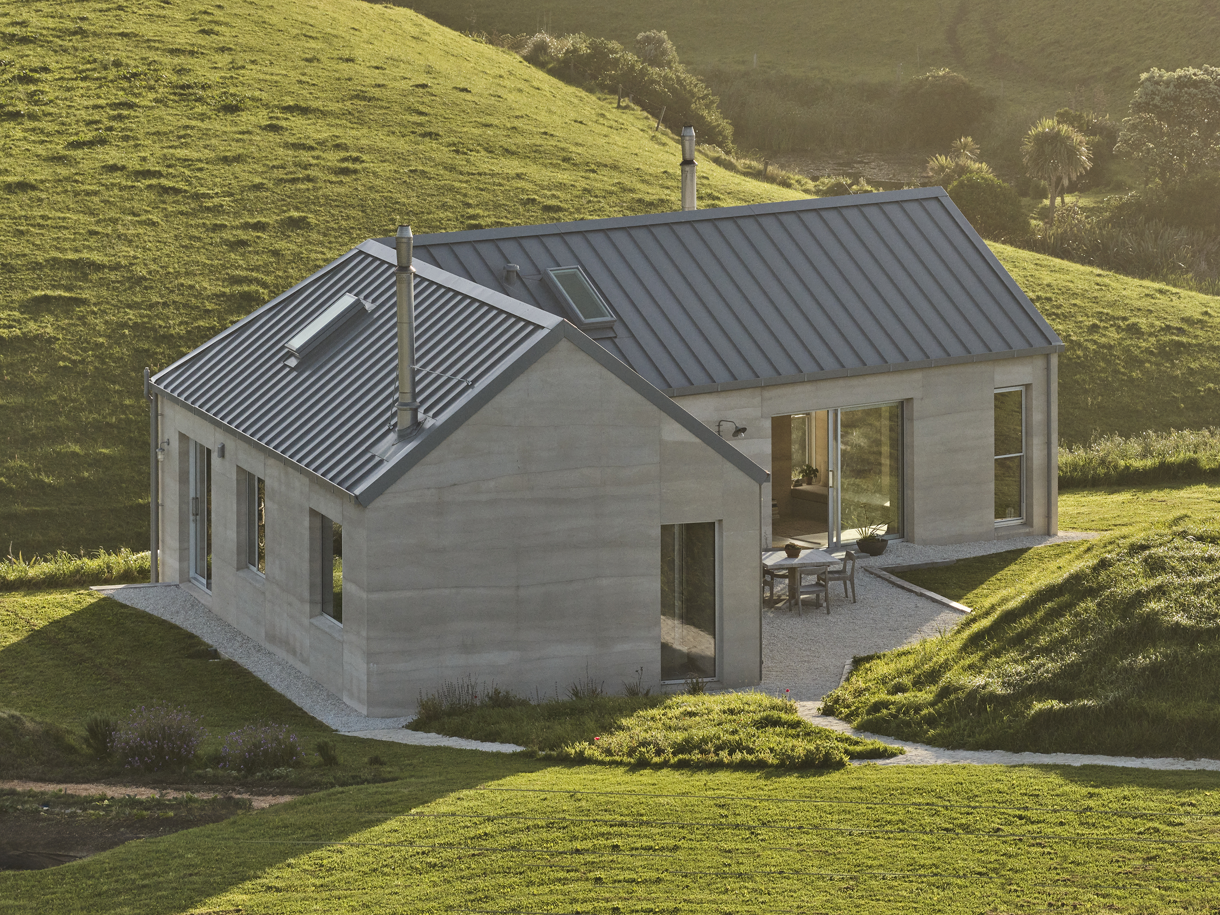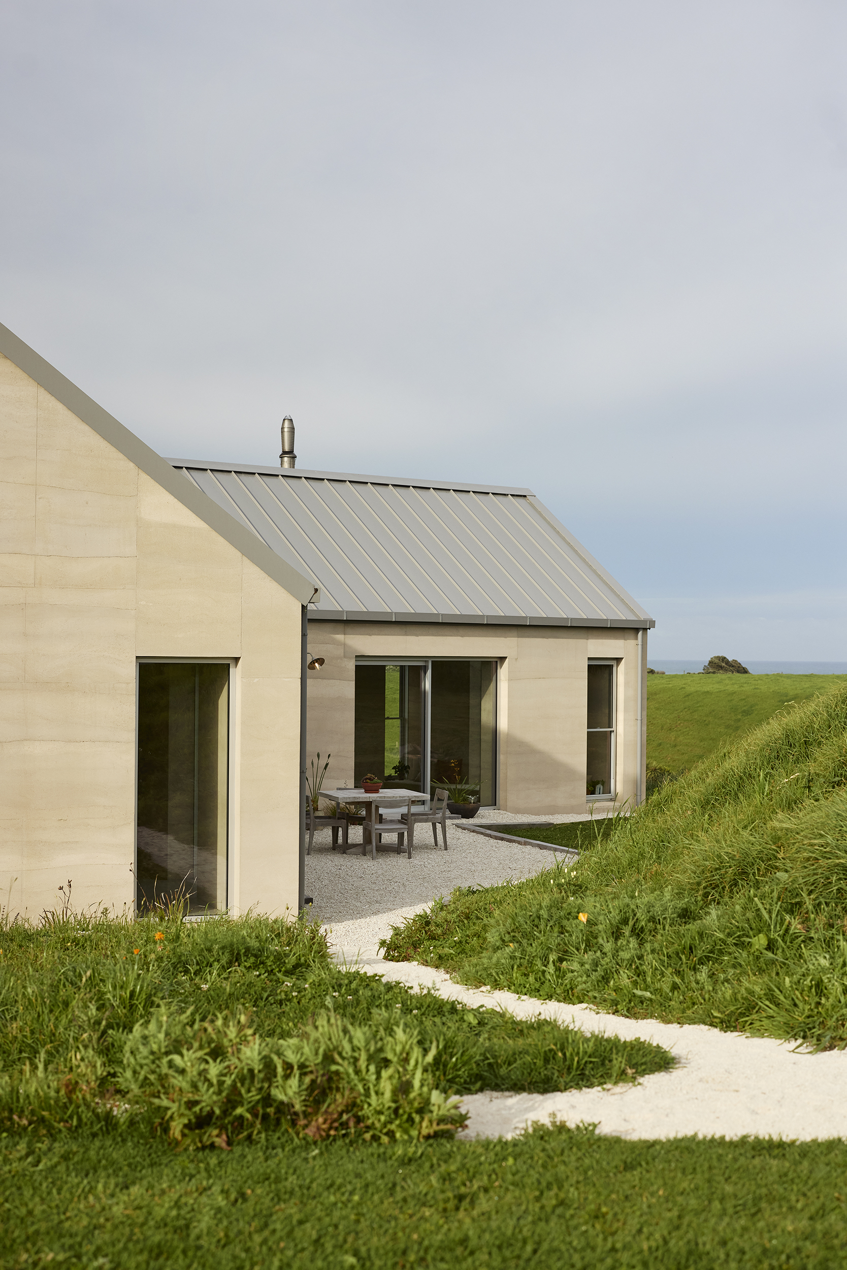 Two pitched gable structures connected in a ‘v’ shaped wind shelter create the footprint for this compact 135m2 rammed earth home just outside of Ōkato in rural Taranaki.