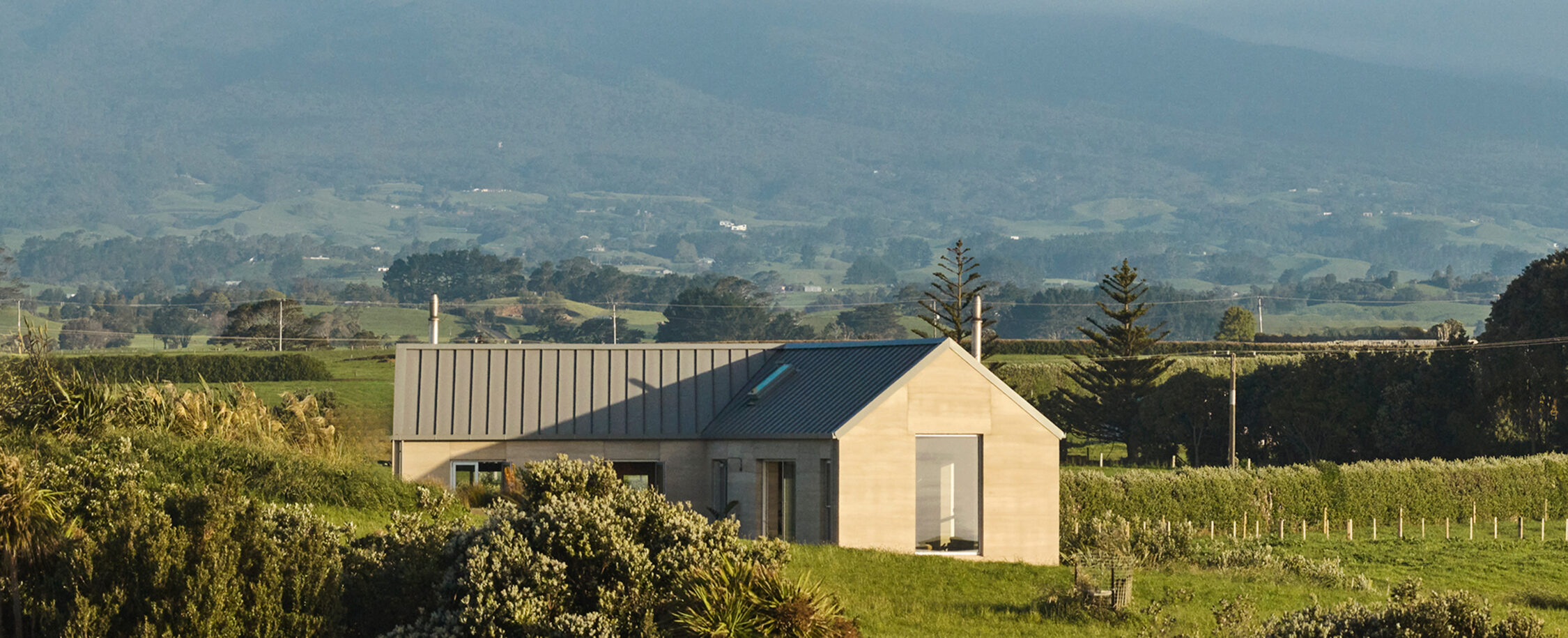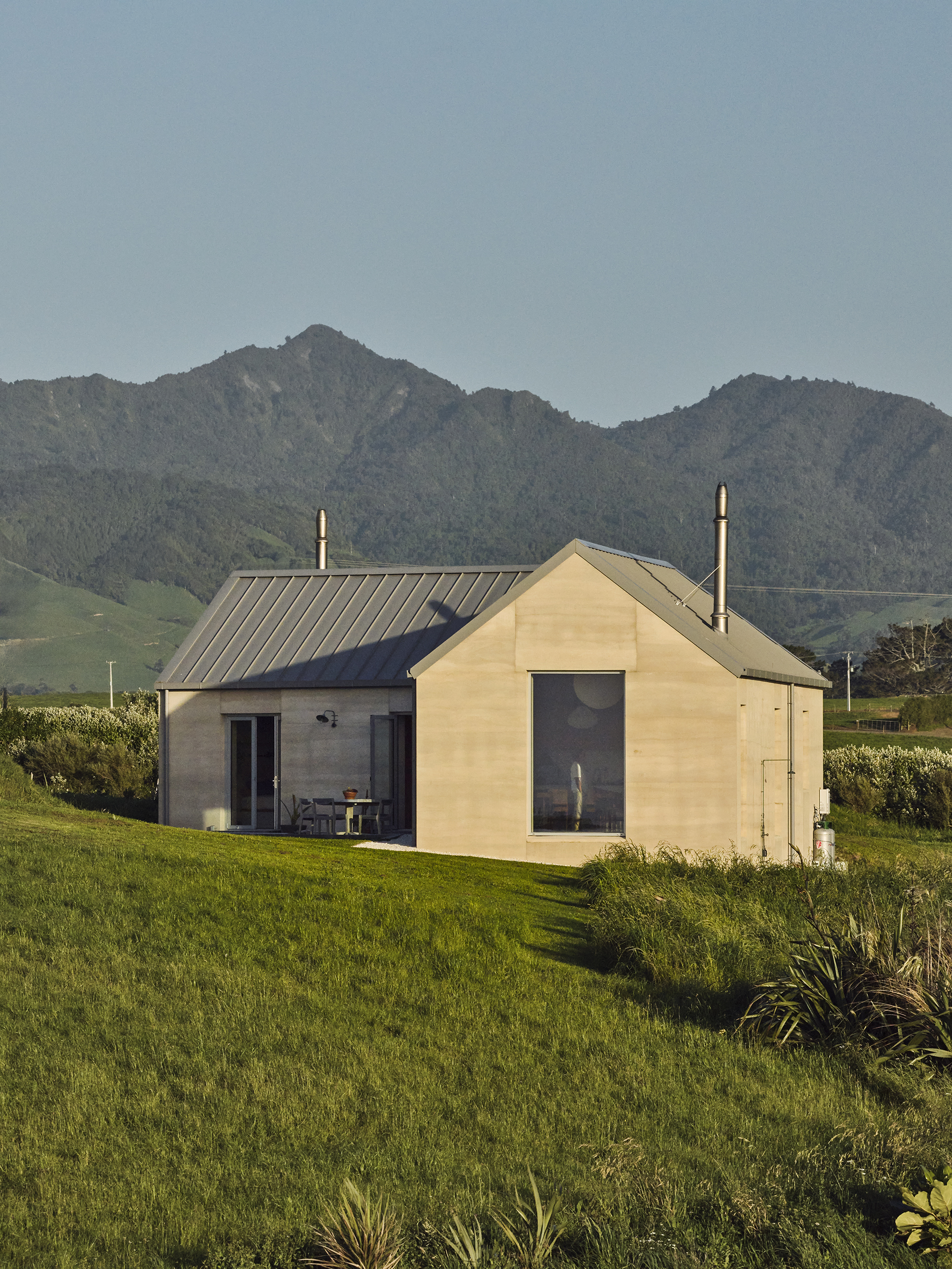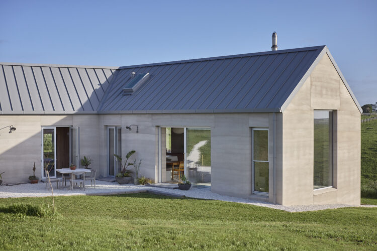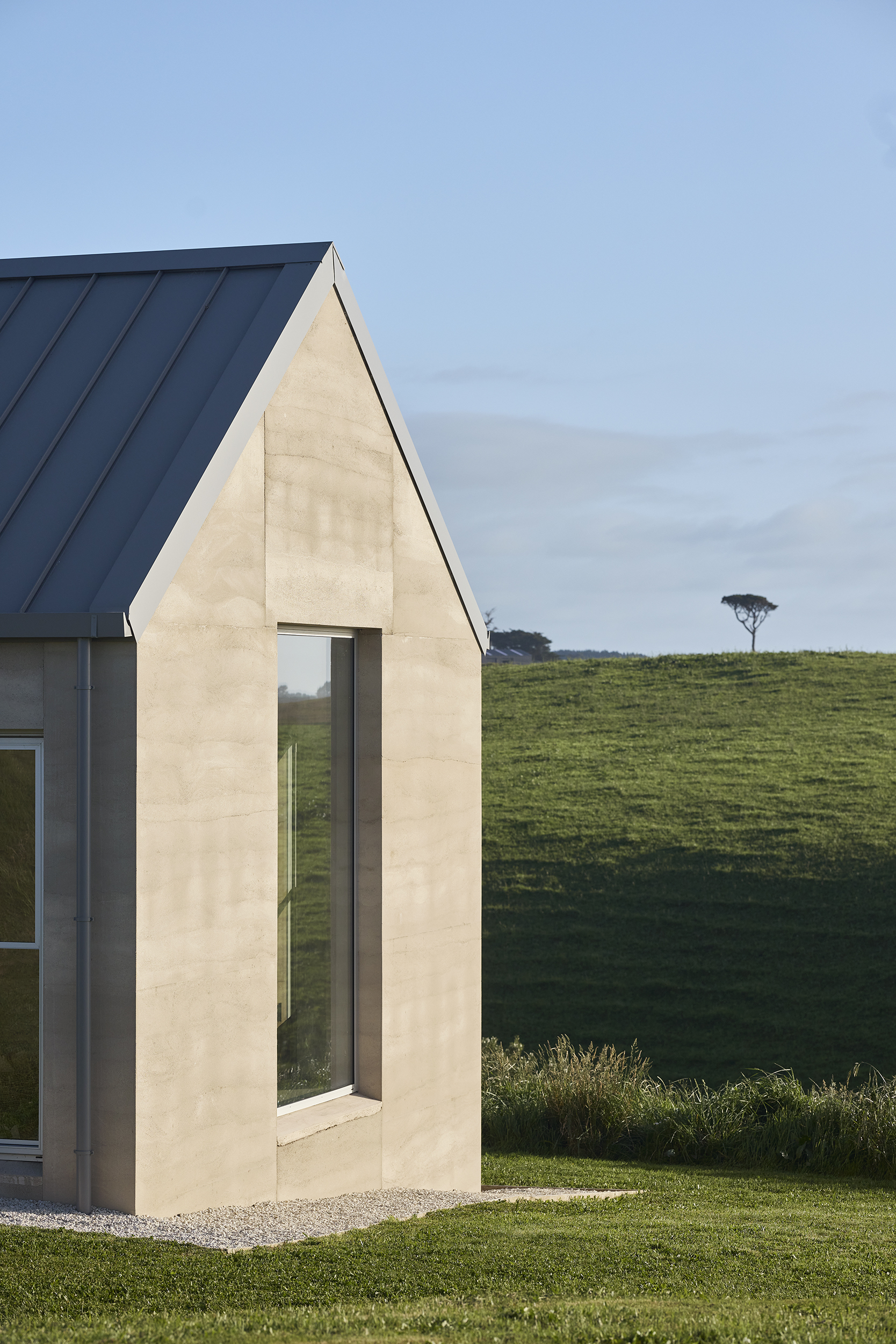 Two pitched gable structures connected in a ‘v’ shaped wind shelter create the footprint for this compact 135m2 rammed earth home just outside of Ōkato in rural Taranaki.