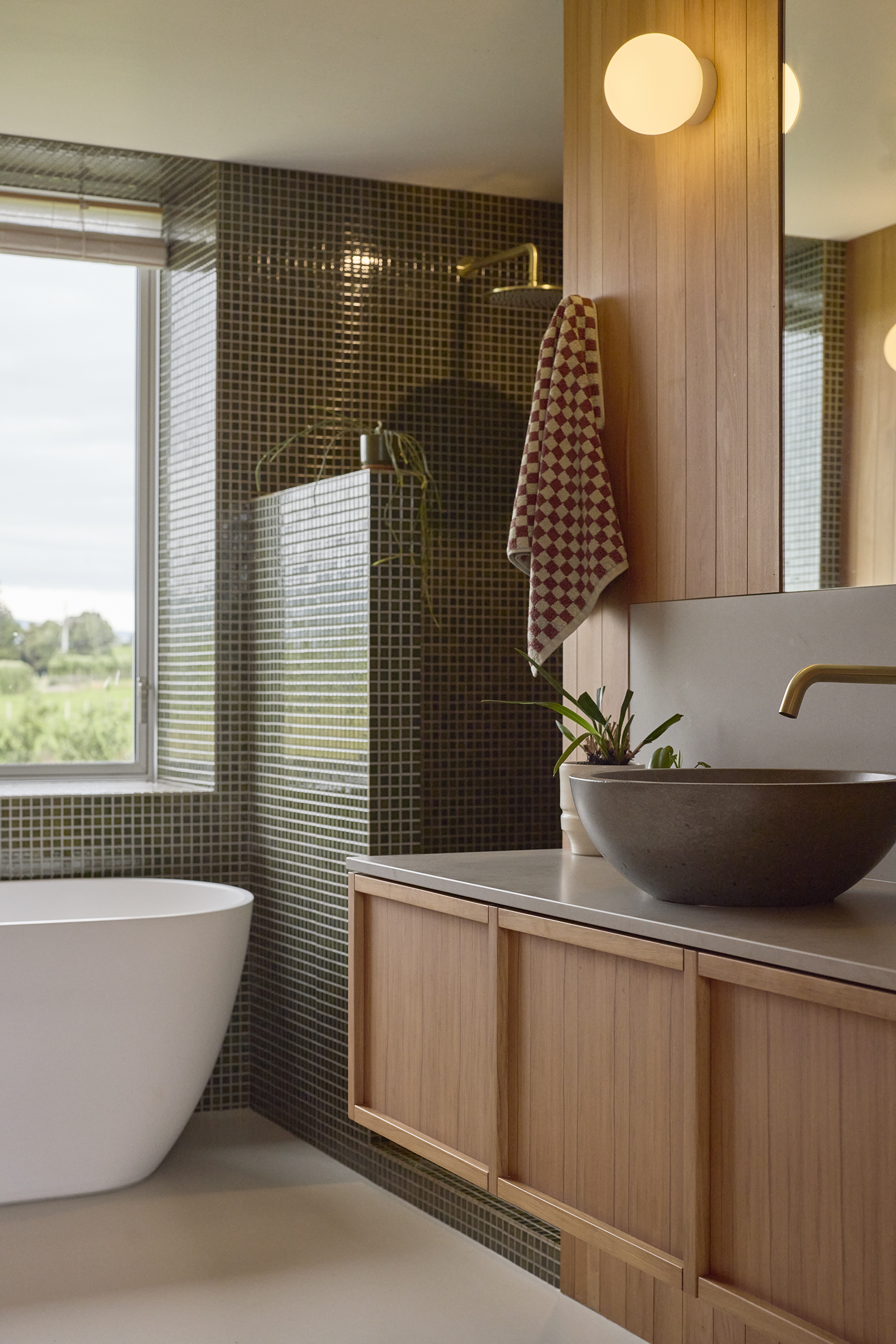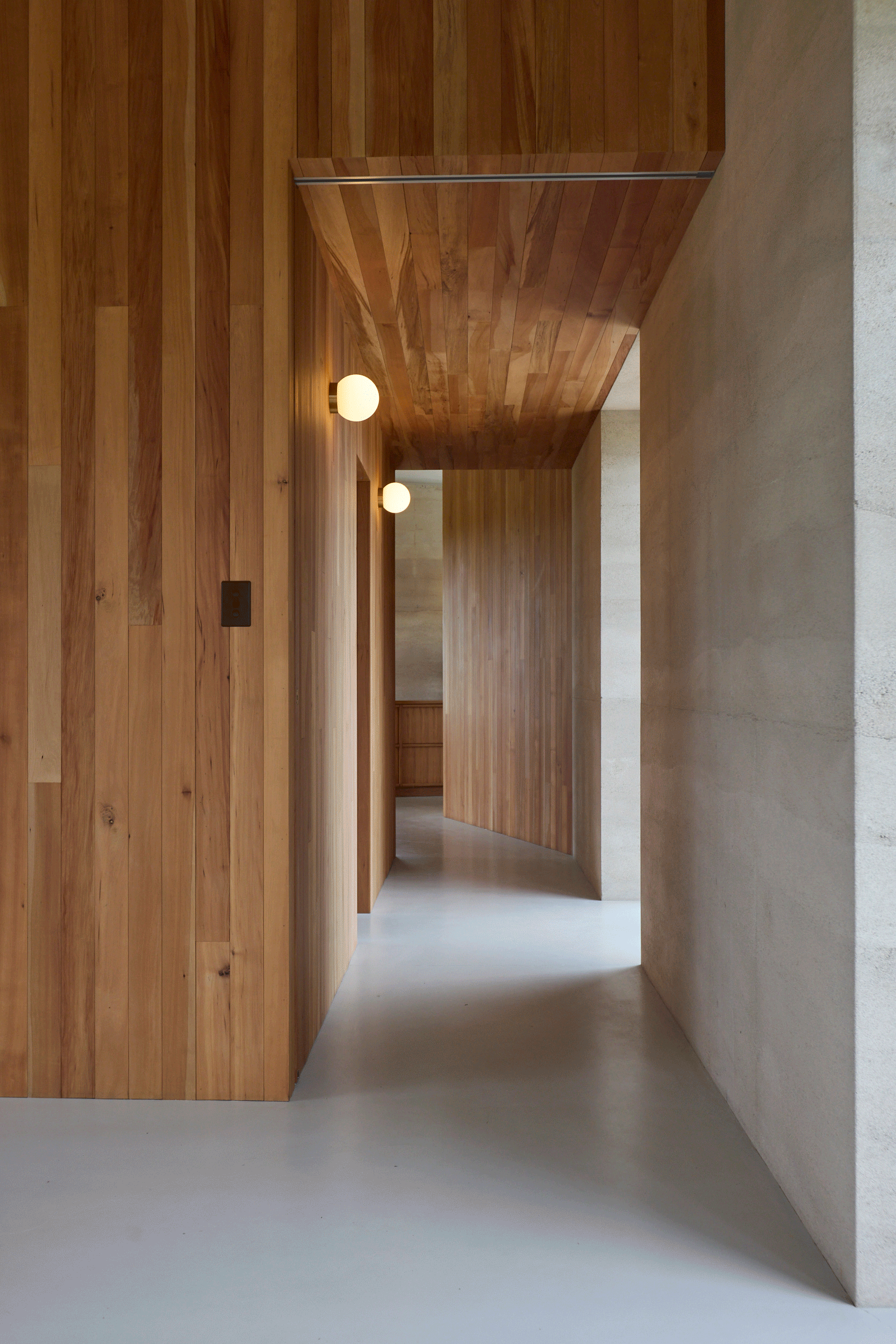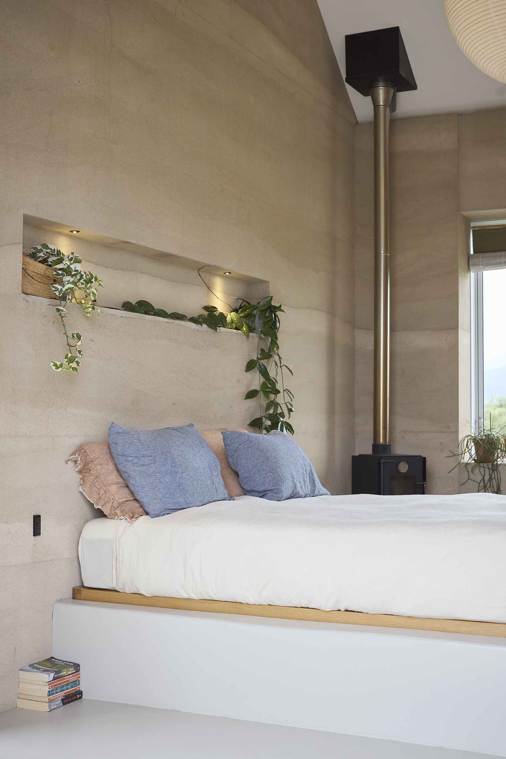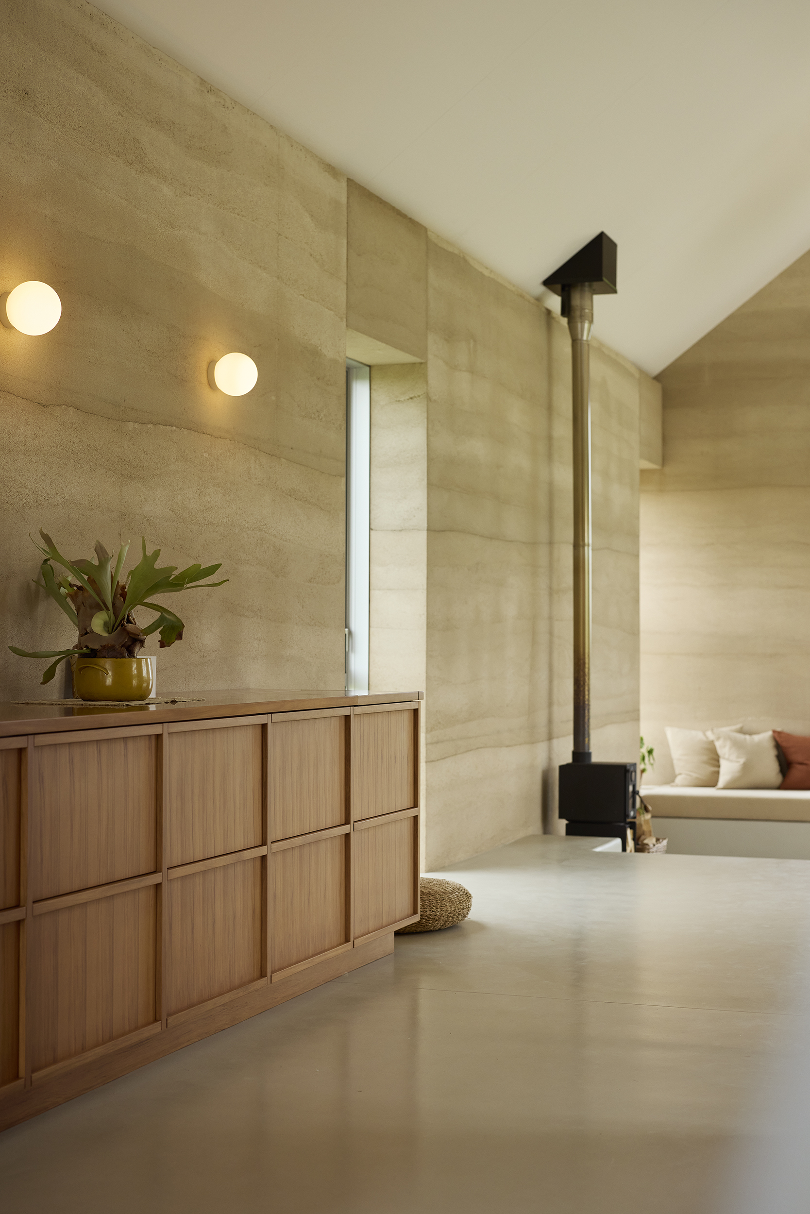 The orientation of the structure on its site is specific for natural heating and cooling of the home. The wood burners are mostly for ambience although paired with the passive design means the air remains consistently dry without any electric heating. Solar panels on the nearby shed are designed alongside water and waste systems to operate within clear limits for this home. It is constructed almost entirely from rammed earth and formwork timber used for boxing of the walls is reused elsewhere in the build with some leftover material used for paths and hard landscaping.