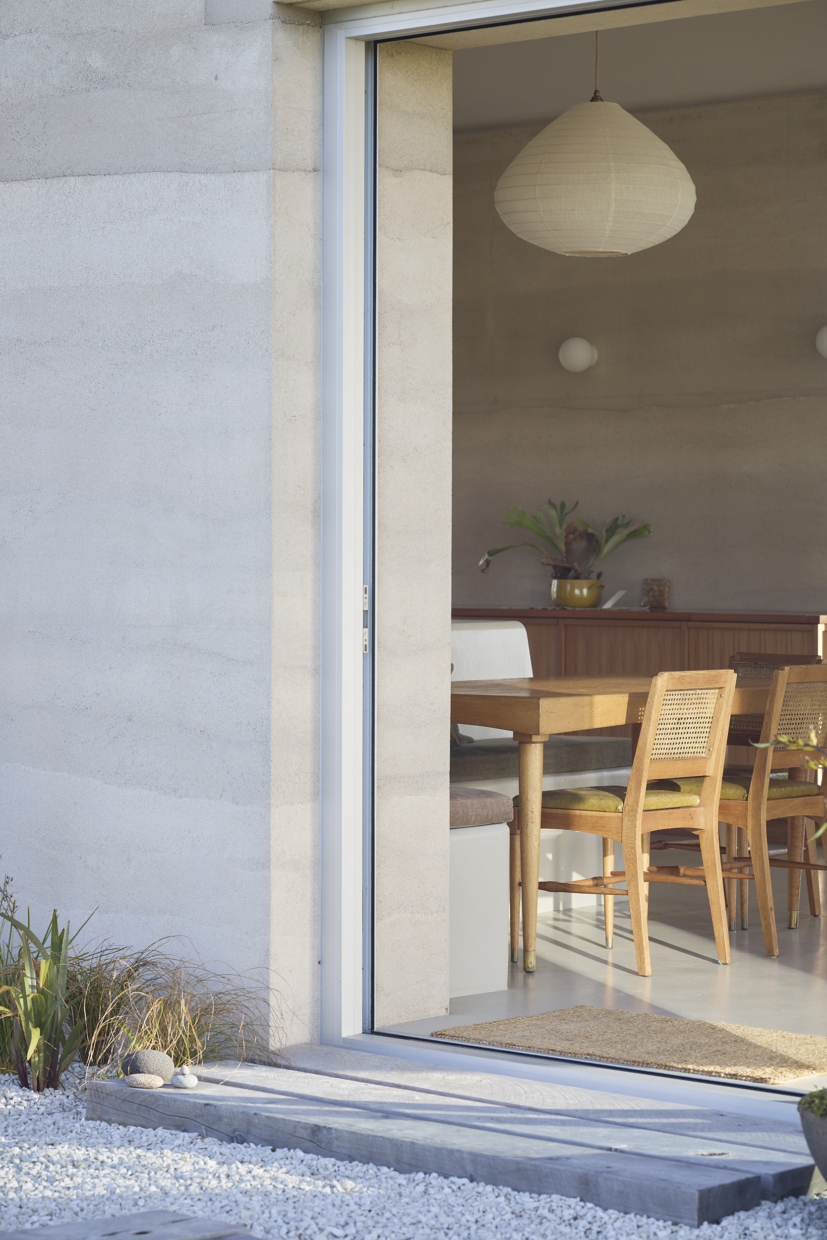 An early focus on sustainability and material efficiency led the project toward rammed earth as the primary construction system. Each opening to the buildings exterior has purpose, and while the rugged coastal Ōkato site has uninterrupted views to the north and west, the house resists the urge to use curtain walls of glass. Instead, the softly-textured rammed earth is a unique interior and exterior wall finish that provides structure and shelter with exceptional thermal, and acoustic performance.