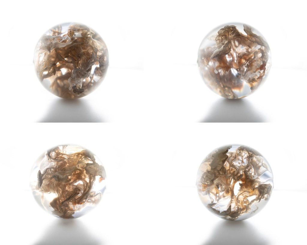 Designed to contain multiple types of melanin sourced from a variety of samples, including human hair, fish inks, mushrooms, feathers, and other sources, the bio-inspired material is currently shown across a small series of spherical objects featuring a single or multiple connected channel filled with liquid melanin, each showcasing a wide range of colors with their own unique light absorption properties. The hope is that in time, liquid melanin would be incorporated into larger sheets of glass and used as transparent architectural surfaces as responsive and adaptive to the elements as our own skin.