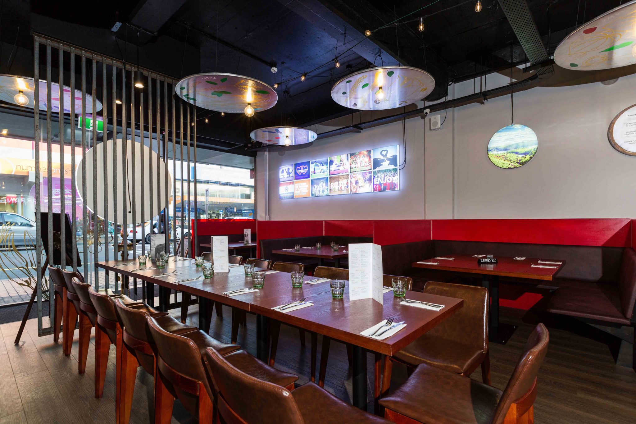 The brief was for a modern, crisp and contemporary interior that showed the fusion between Kerala cuisine and Taranaki. A peace wall was designed for the restaurant when research discovered an historic meeting between Ghandi’s and Te Whiti’s Grandsons at Parihaka.