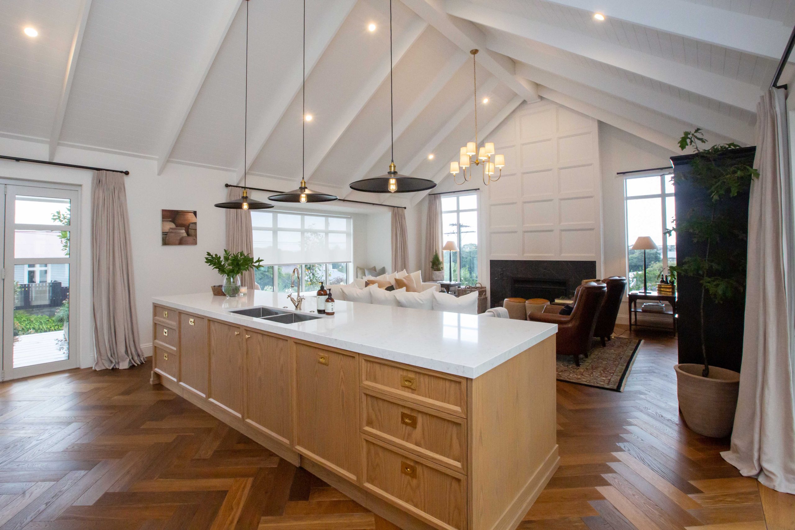 The cladding combined with the design’s large gables, extruded chimneys and large overhanging eves add to its vintage appeal. The home is built using modern construction techniques yet appears next to the surrounding homes as if it has been there since the suburbs inception.