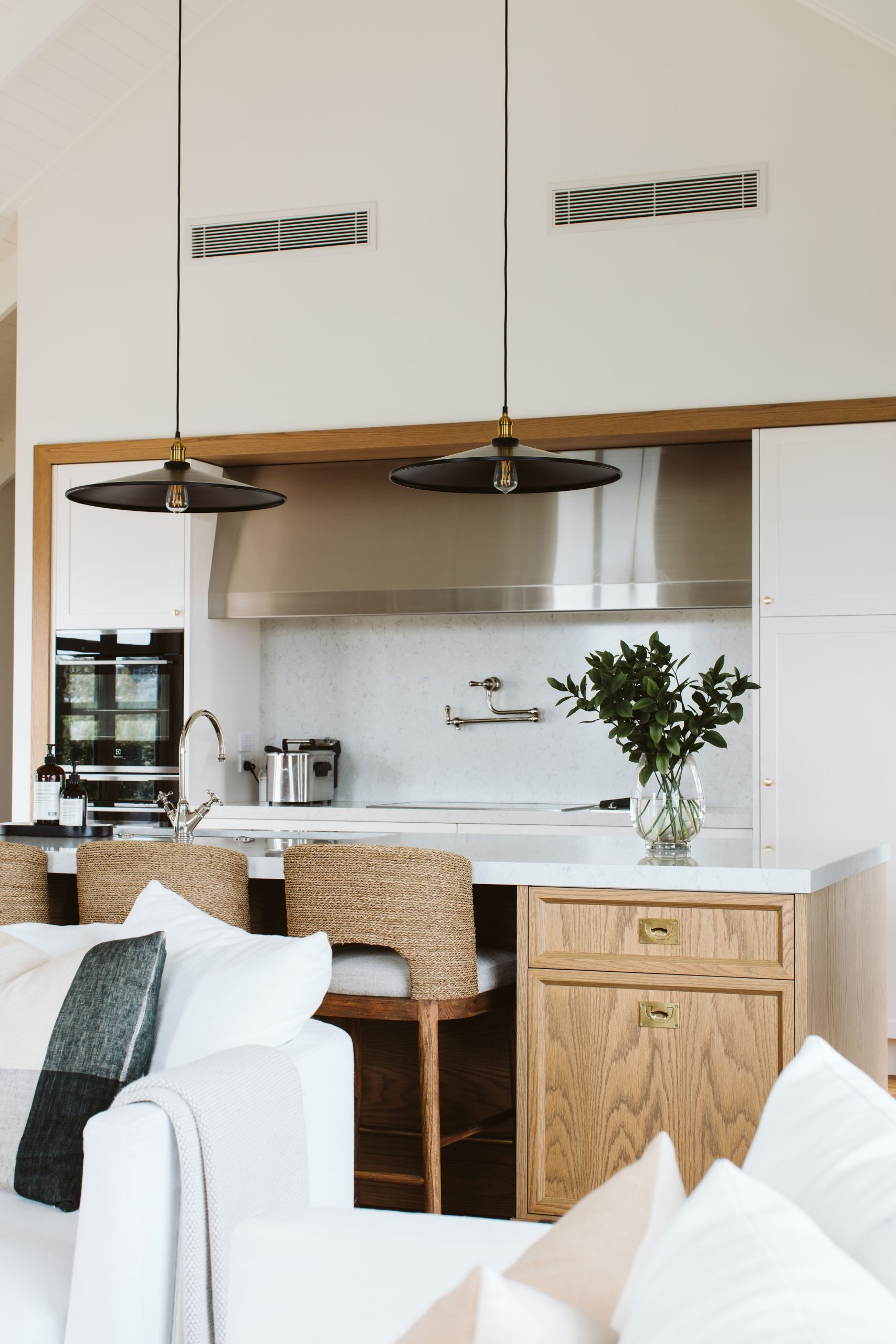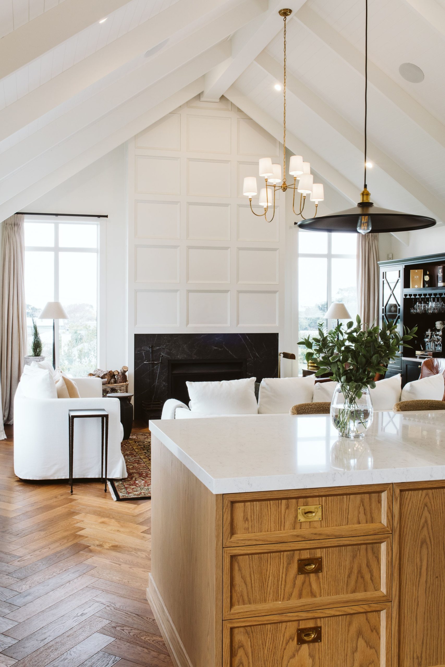 This special home is unique within it’s well established suburb, and while being brand new, it exudes the rustic, vintage appeal of homes from America’s coveted Hamptons. The home is clad in a combination of linear weatherboard a timber tile. The home encompasses 5 bedrooms + separate office, play and music rooms and the footprint of home sits to the southern end of a large 1300m2 site. It is essentially formed by two wings – a living wing and a sleeping wing that are connected by a central formal entry and circulation route. The home has both formal and informal living areas that open onto the north and western landscaped terraces.