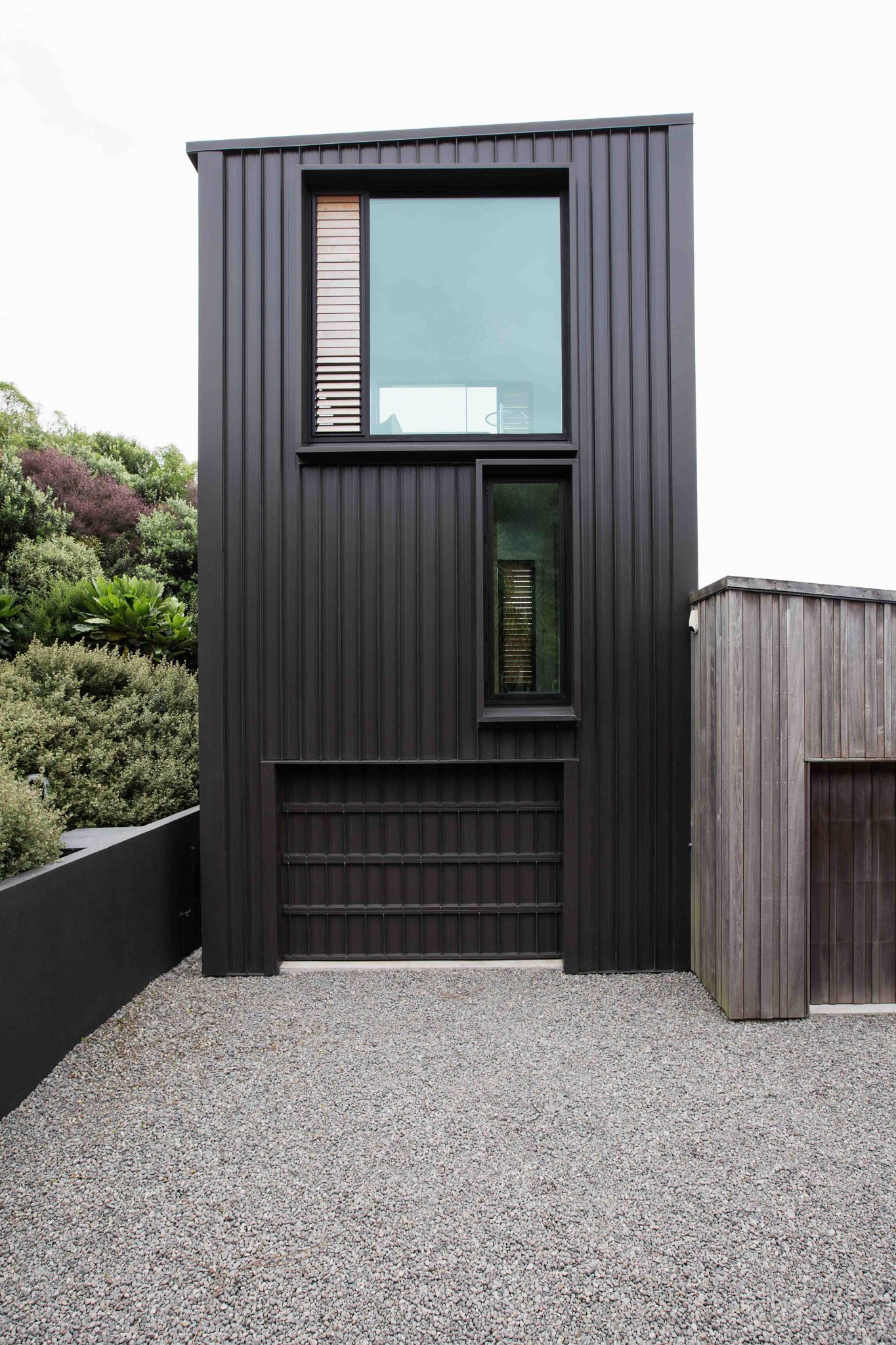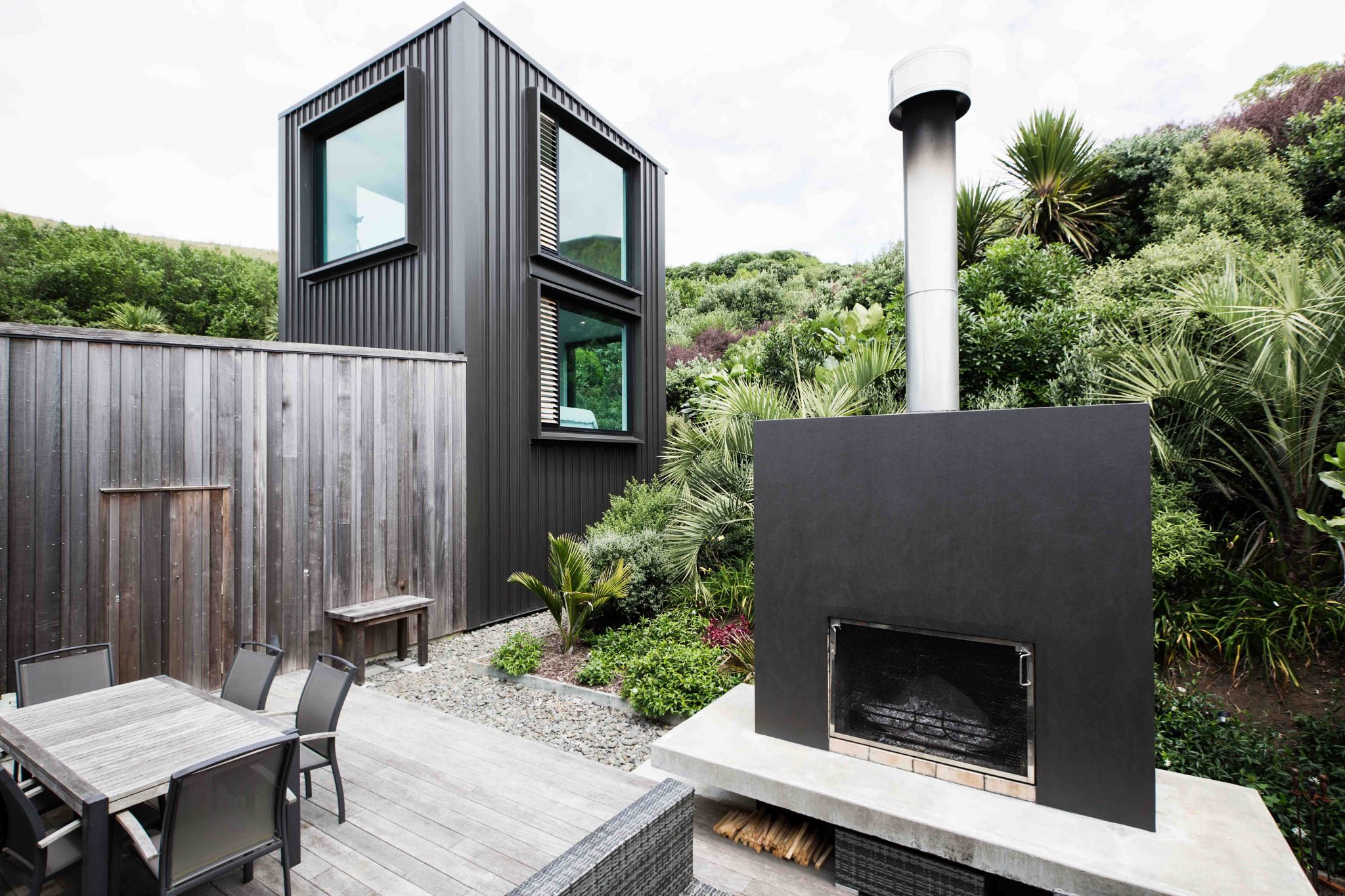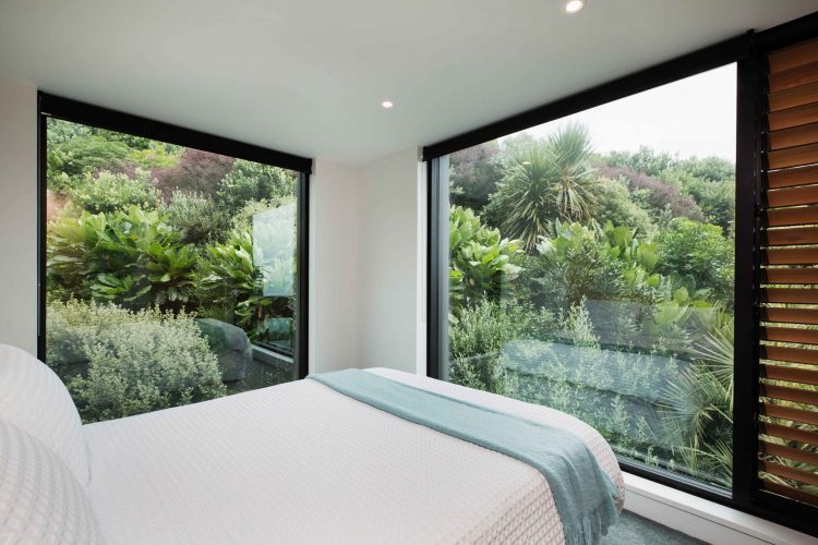 The expansive, double glazed windows open the home to watch over Taranaki’s changeable climatic conditions, seeming to allow you to snuggle up in bed among the native bush. Like the main house, the materials for the Tower were selected for their embodiment of the local coastal character.