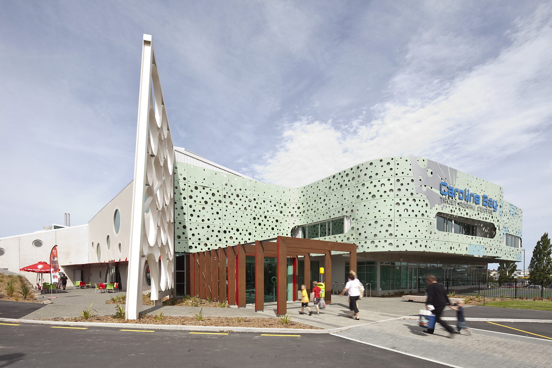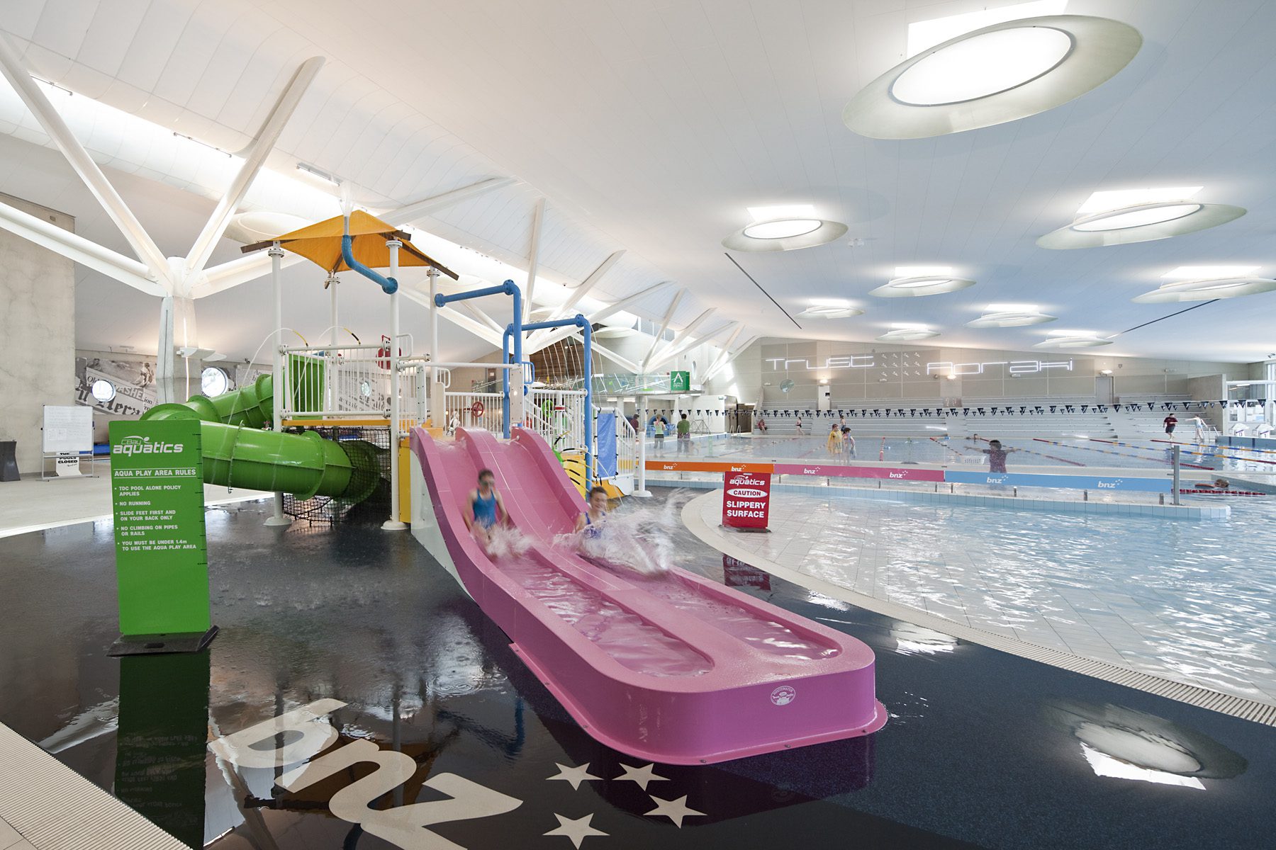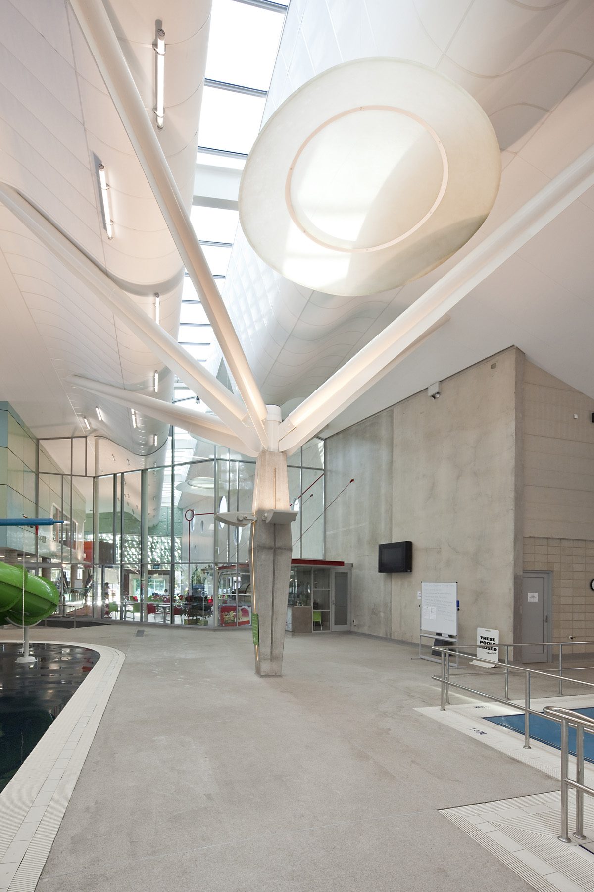 This vision has come to life, providing another prolific spot along the dusky Caroline Bay. Key to the success of the project is the building structure and pools design. Elegant branching structural steel supports an enormous roof area with few columns interrupting sight lines through the pool areas.