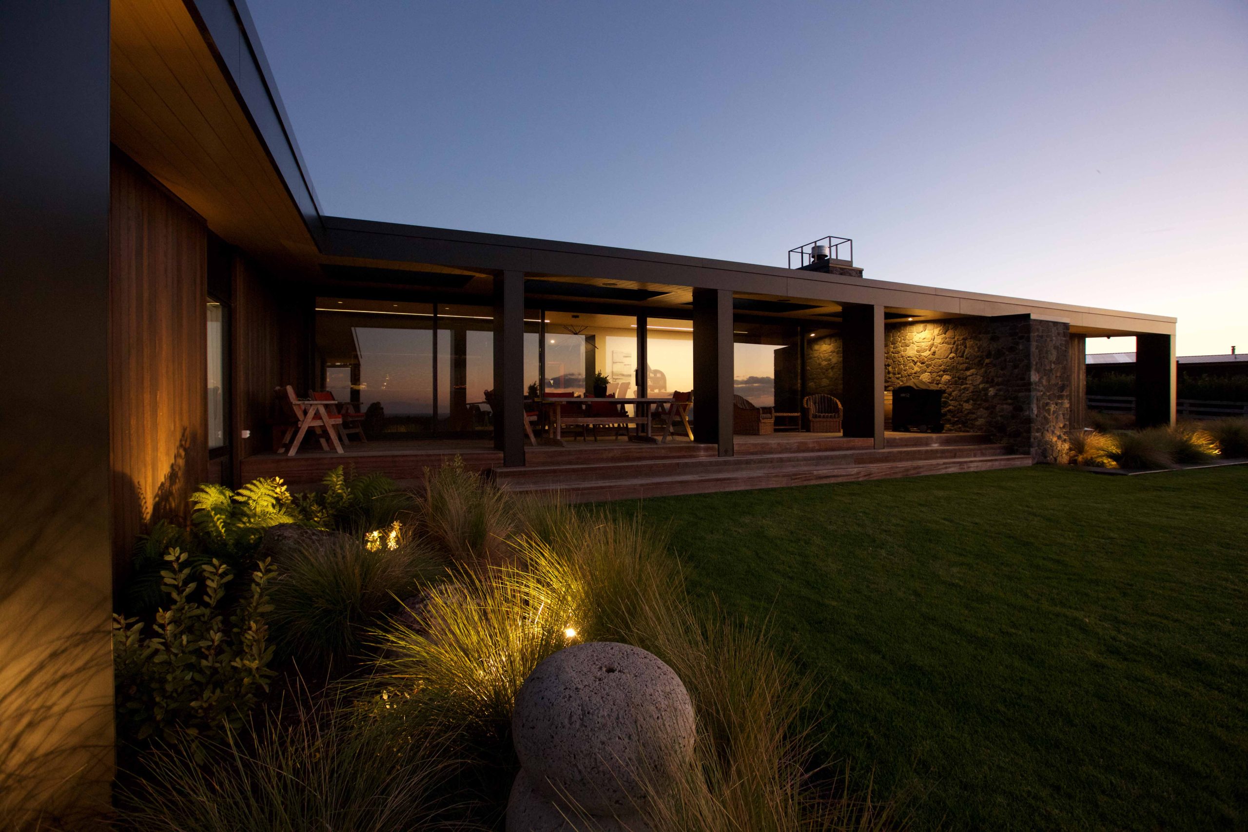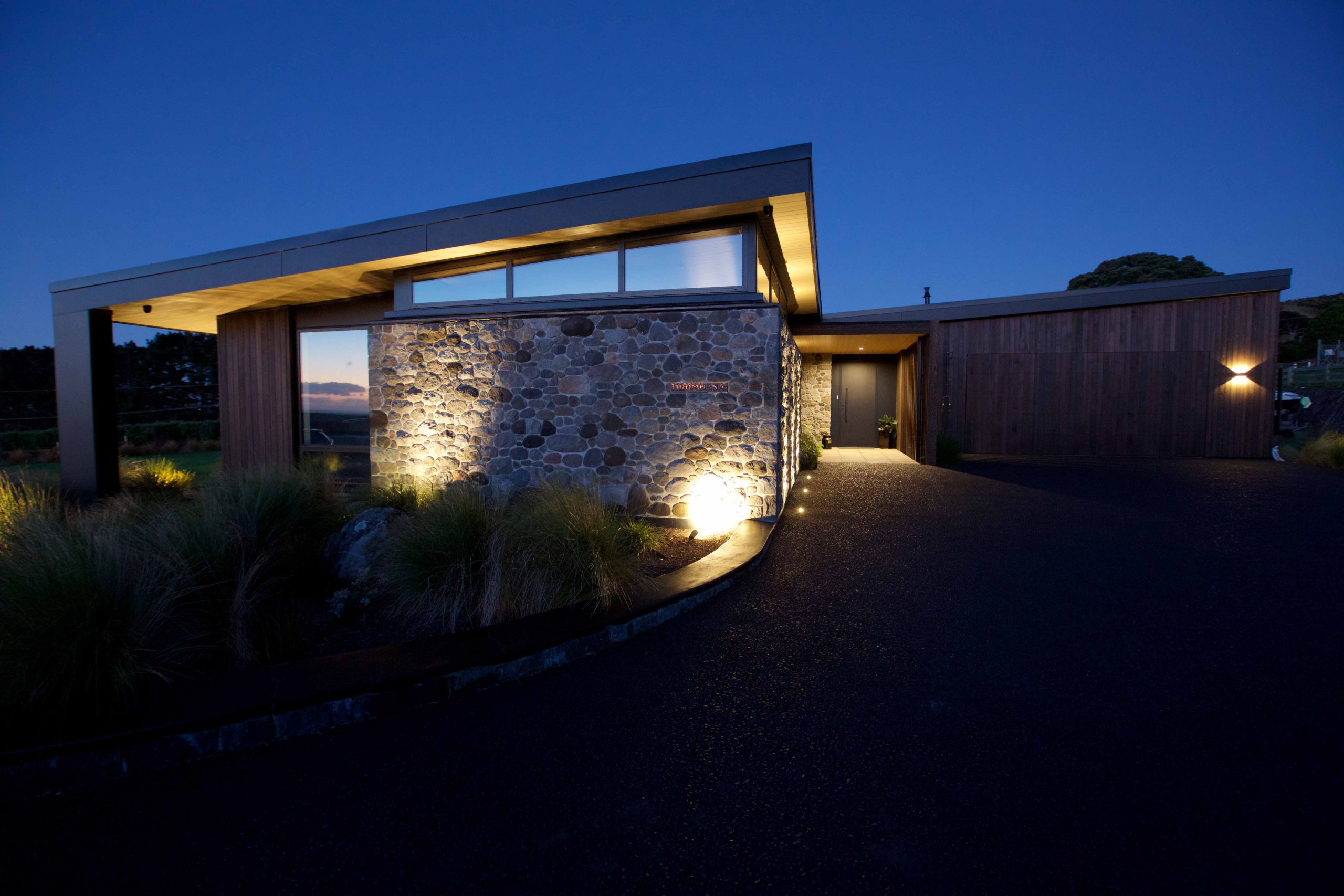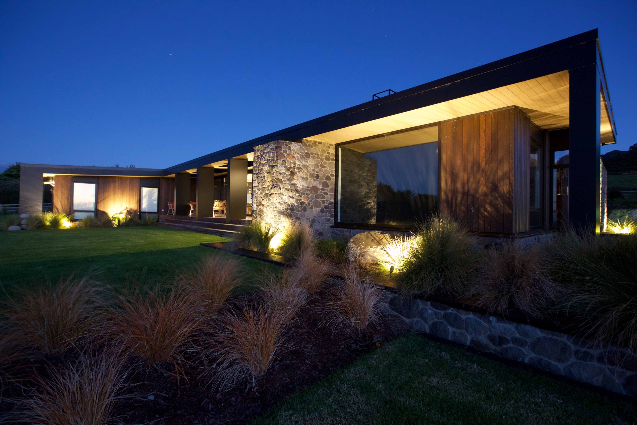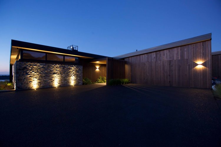 Lighting design for this home is prominent and in low light showcases the house’s defined angles and bold combination of cedar and stone masonry cladding. The large floor plan houses four bedrooms, two with en-suite bathrooms, as well as a triple car garage to the south of the home which adds shelter from the climatic country weather conditions.