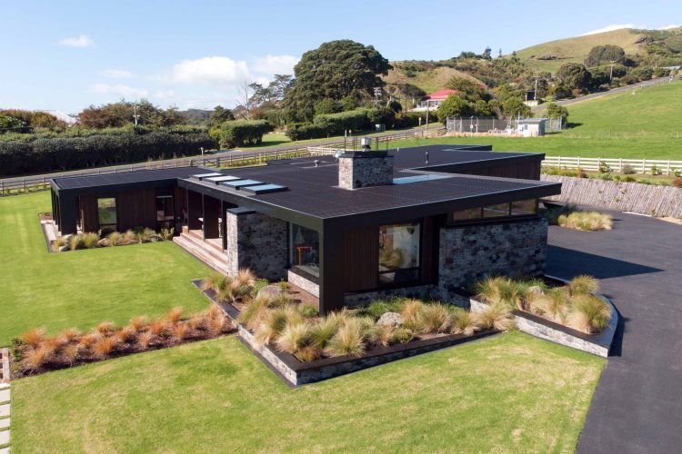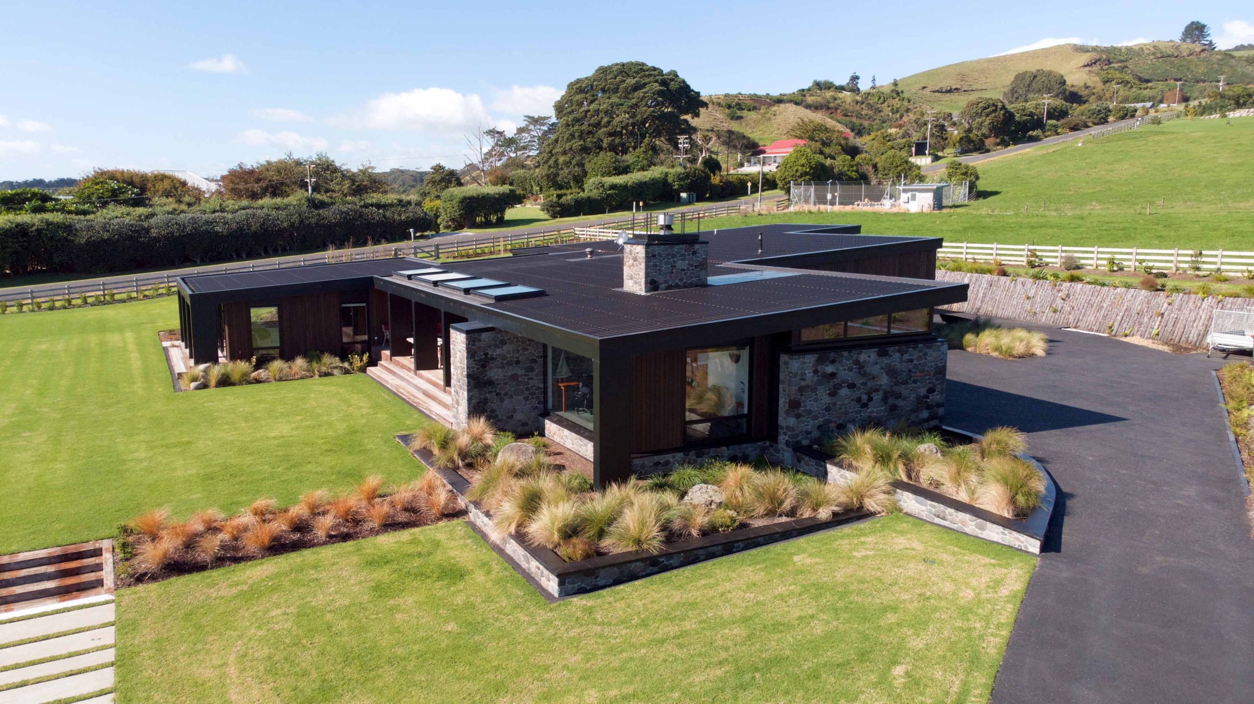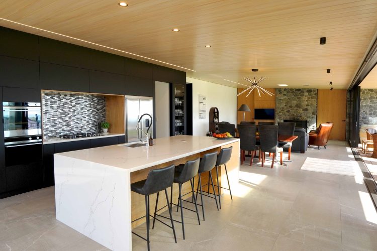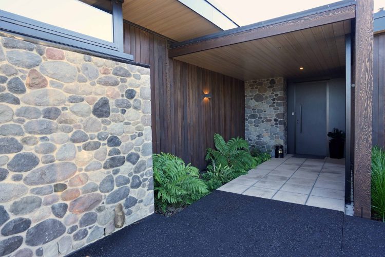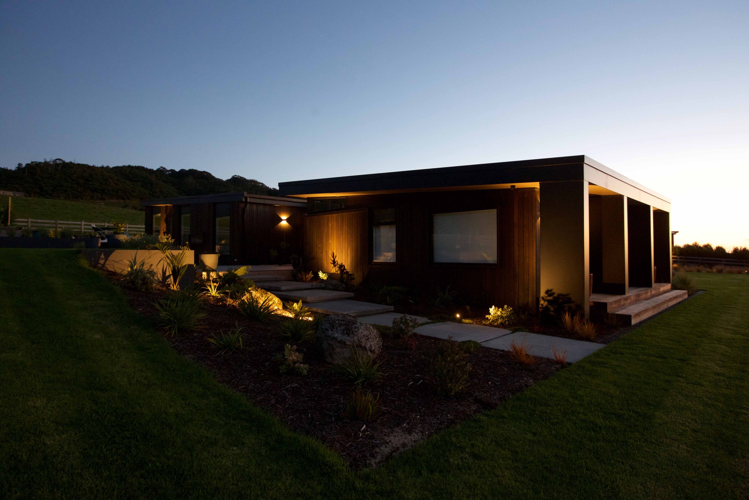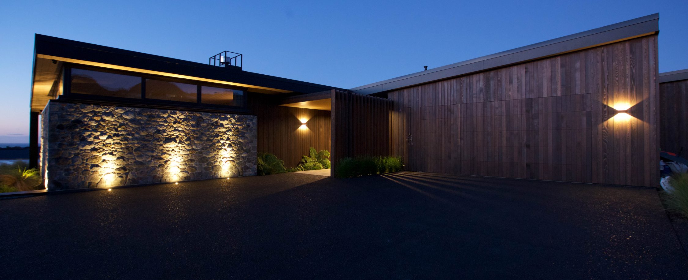 Lighting design for this home is prominent and in low light showcases the house’s defined angles and bold combination of cedar and stone masonry cladding. The large floor plan houses four bedrooms, two with en-suite bathrooms, as well as a triple car garage to the south of the home which adds shelter from the climatic country weather conditions.