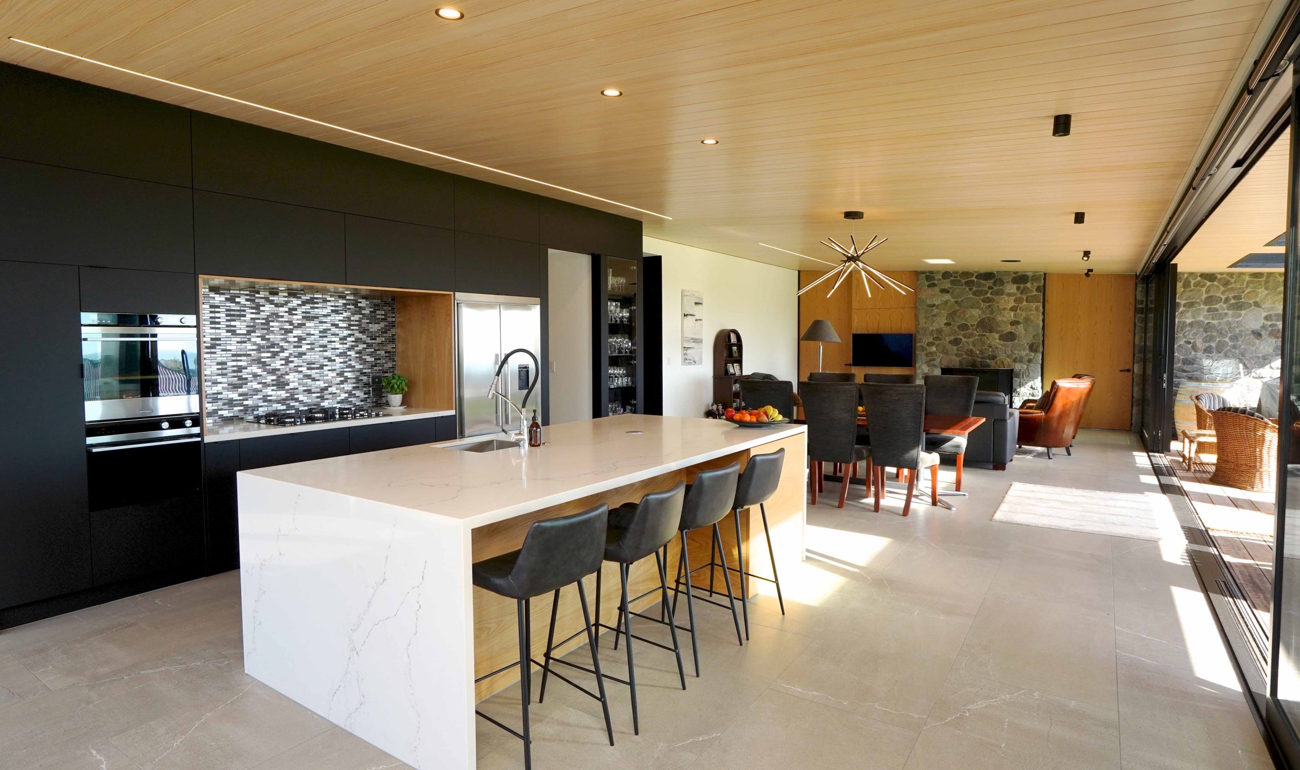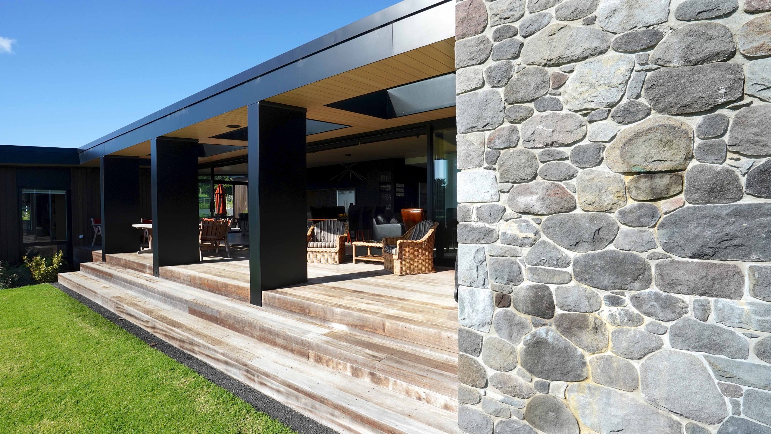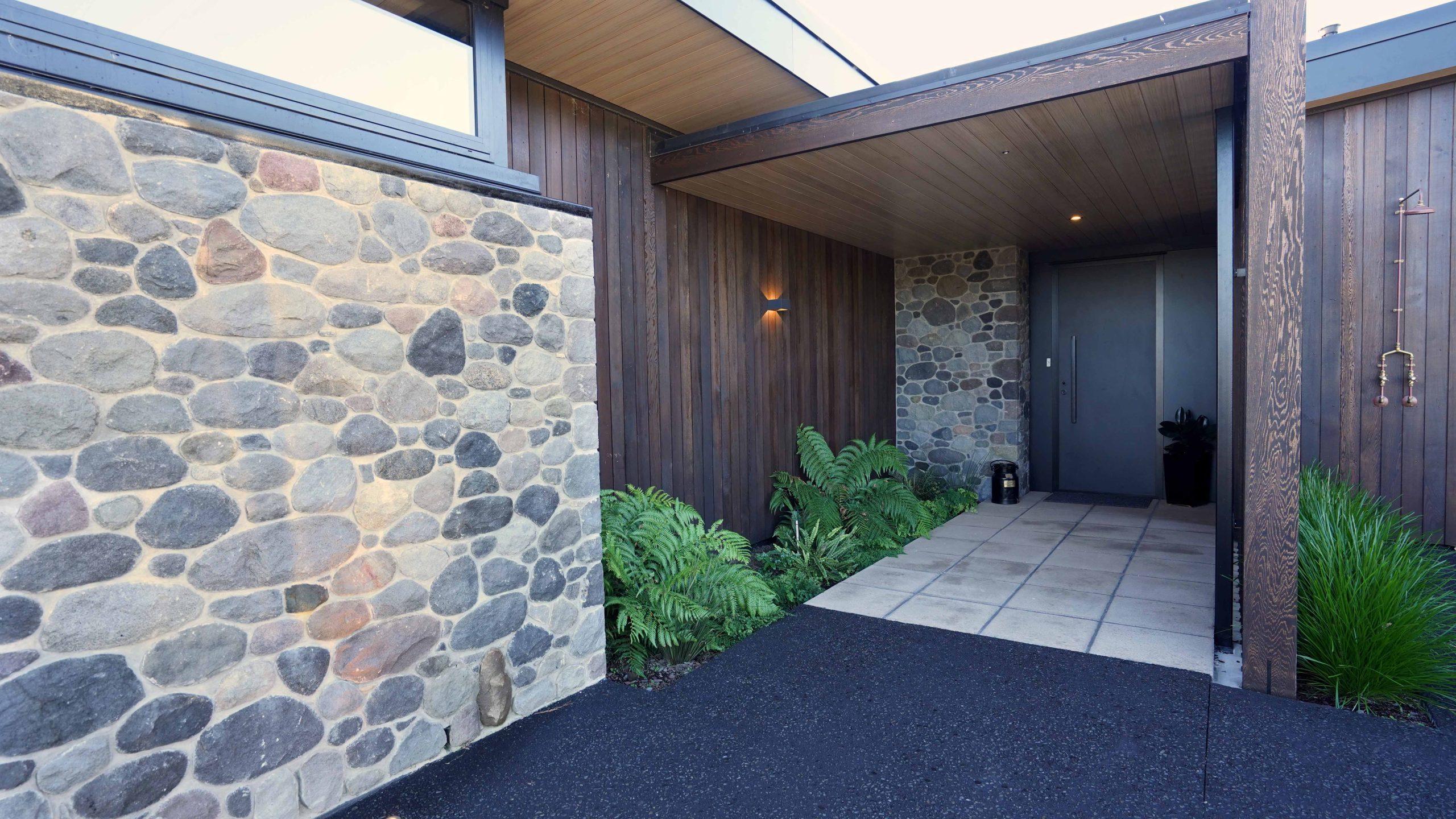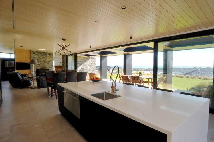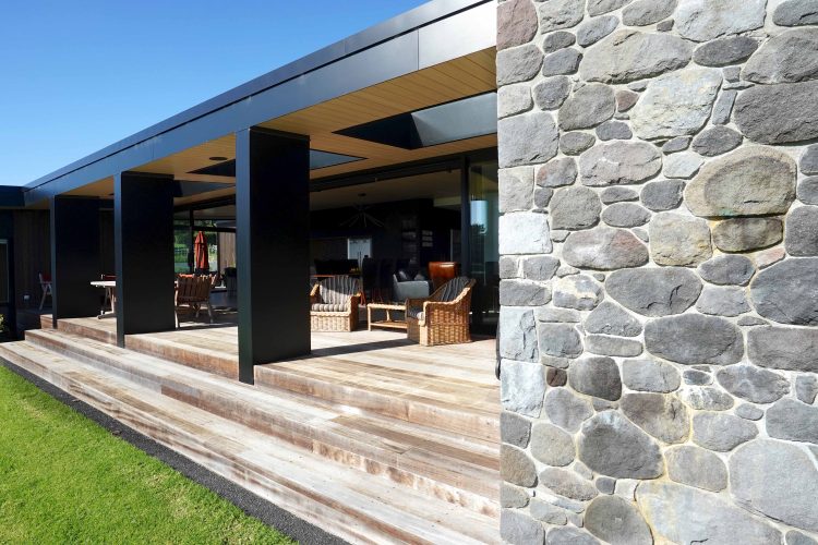 Lighting design for this home is prominent and in low light showcases the house’s defined angles and bold combination of cedar and stone masonry cladding. The large floor plan houses four bedrooms, two with en-suite bathrooms, as well as a triple car garage to the south of the home which adds shelter from the climatic country weather conditions.