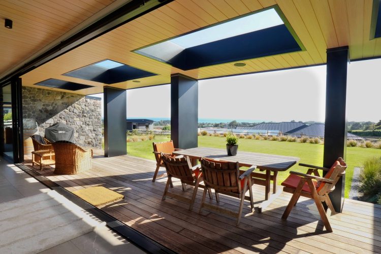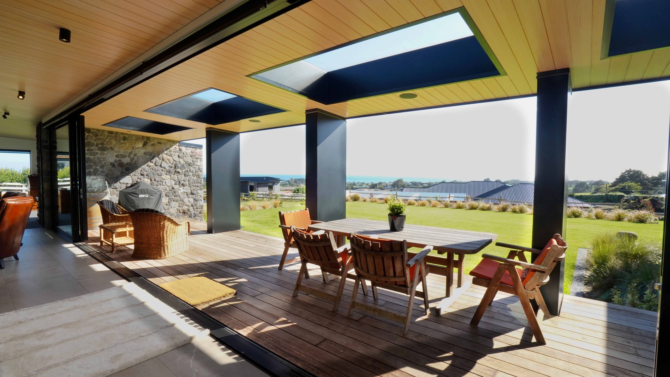 North facing and open plan, the living area is maximised with a 38m² sheltered deck and large backyard. The extended roof structure acts as a canopy to the deck area. This canopy adds a sense of space and scale of living by the continuation of a timber panelled ceiling from inside to out. Substantial landscaping gives purpose to every square meter of the site and adds to the flow from the deck to surrounding garden.