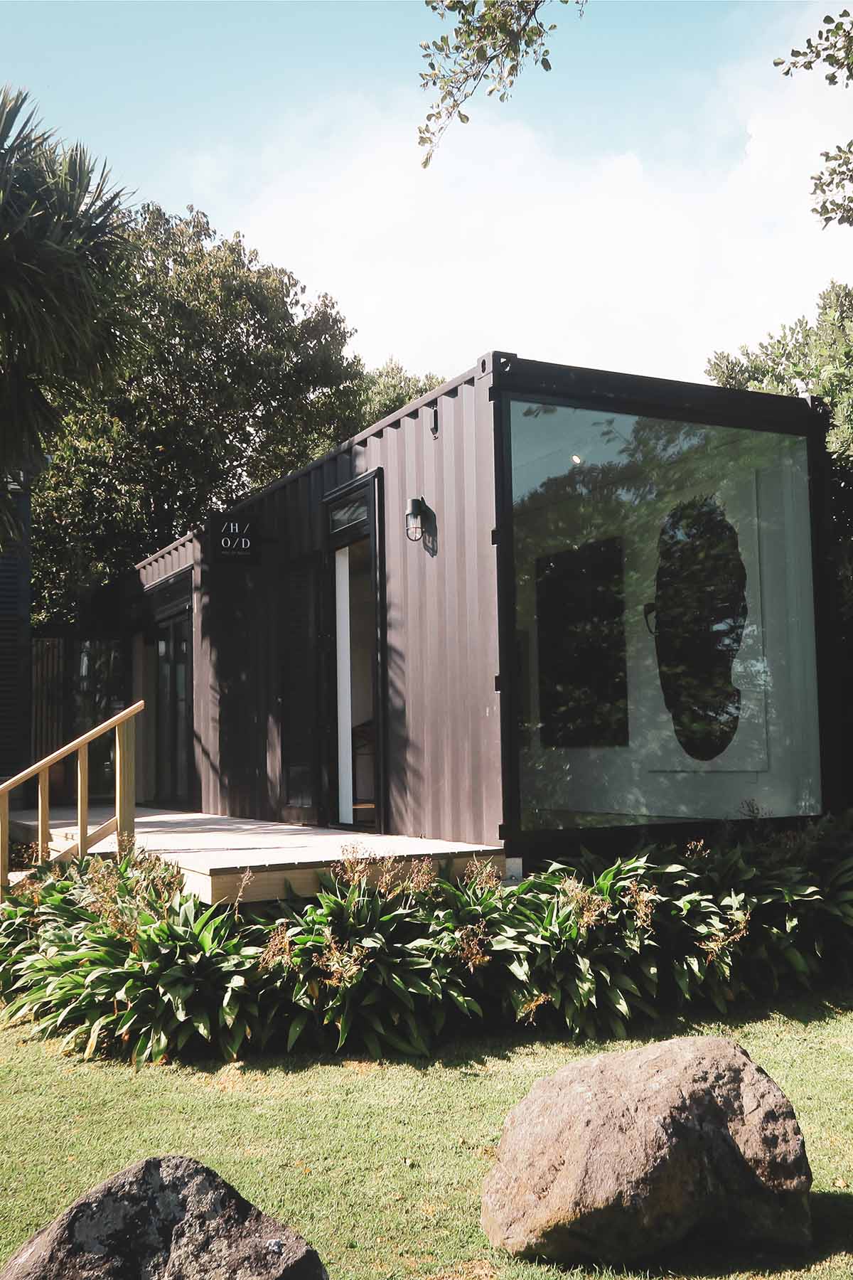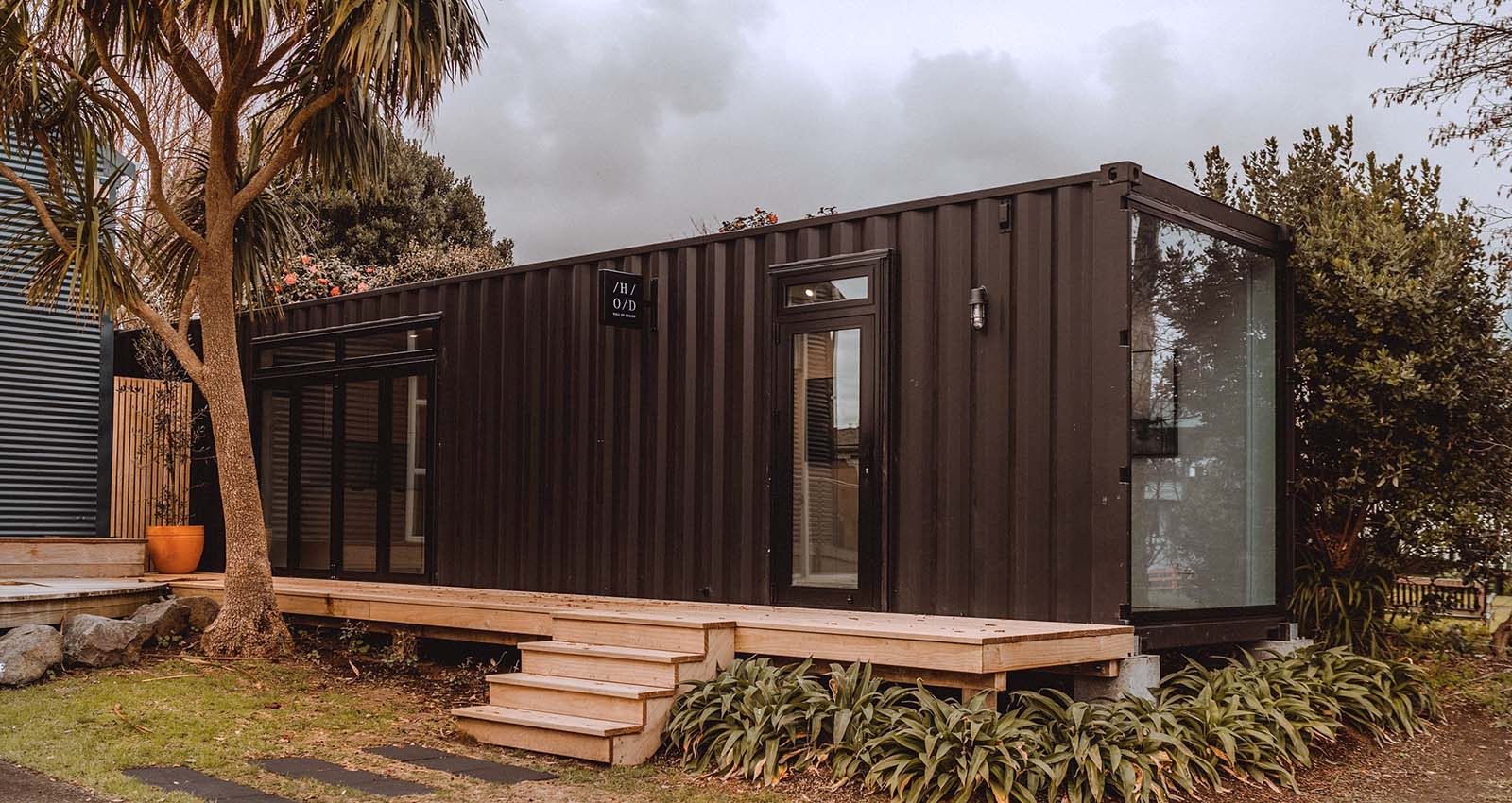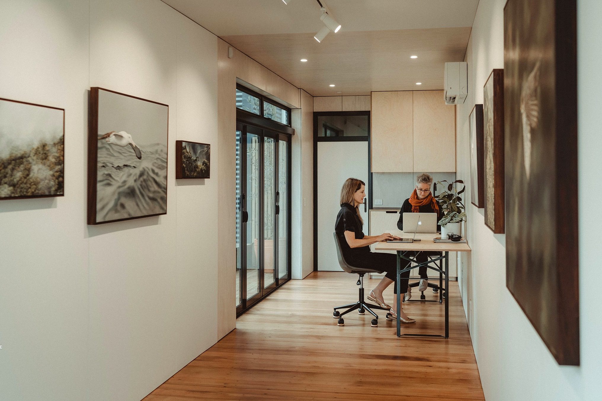 The simplistic and refined space hosts exhibitions and houses workspace for the long established graphic design avenue of HOD. The 40ft shipping container was moved onto site and repurposed to become a lively arts space for the community. We worked closely with the client to ensure the building filled their needs in space and design and met New Zealand building code standards. The containers placement on the boundary ensued appropriate fire rated interior linings, and for durability in its seaside location, a marine coating has been applied to the exterior. The interior has been given a larger sense of space through the use of clean lines and a subtle, smooth transition from the paint finished gallery to the exposed ply workspace. Warmth is given to the space through natural timber flooring and flexible lighting for the changing exhibition space is an important element to the look and feel of the repurposed container.