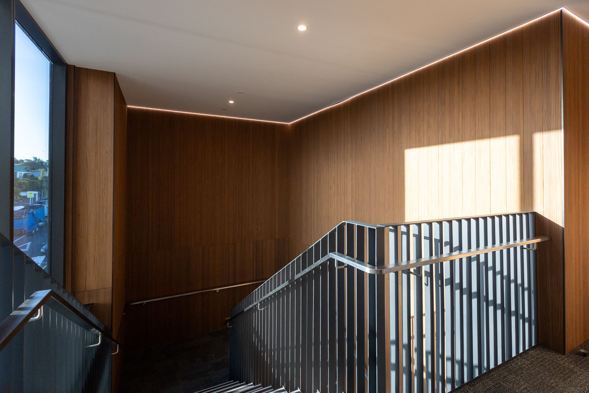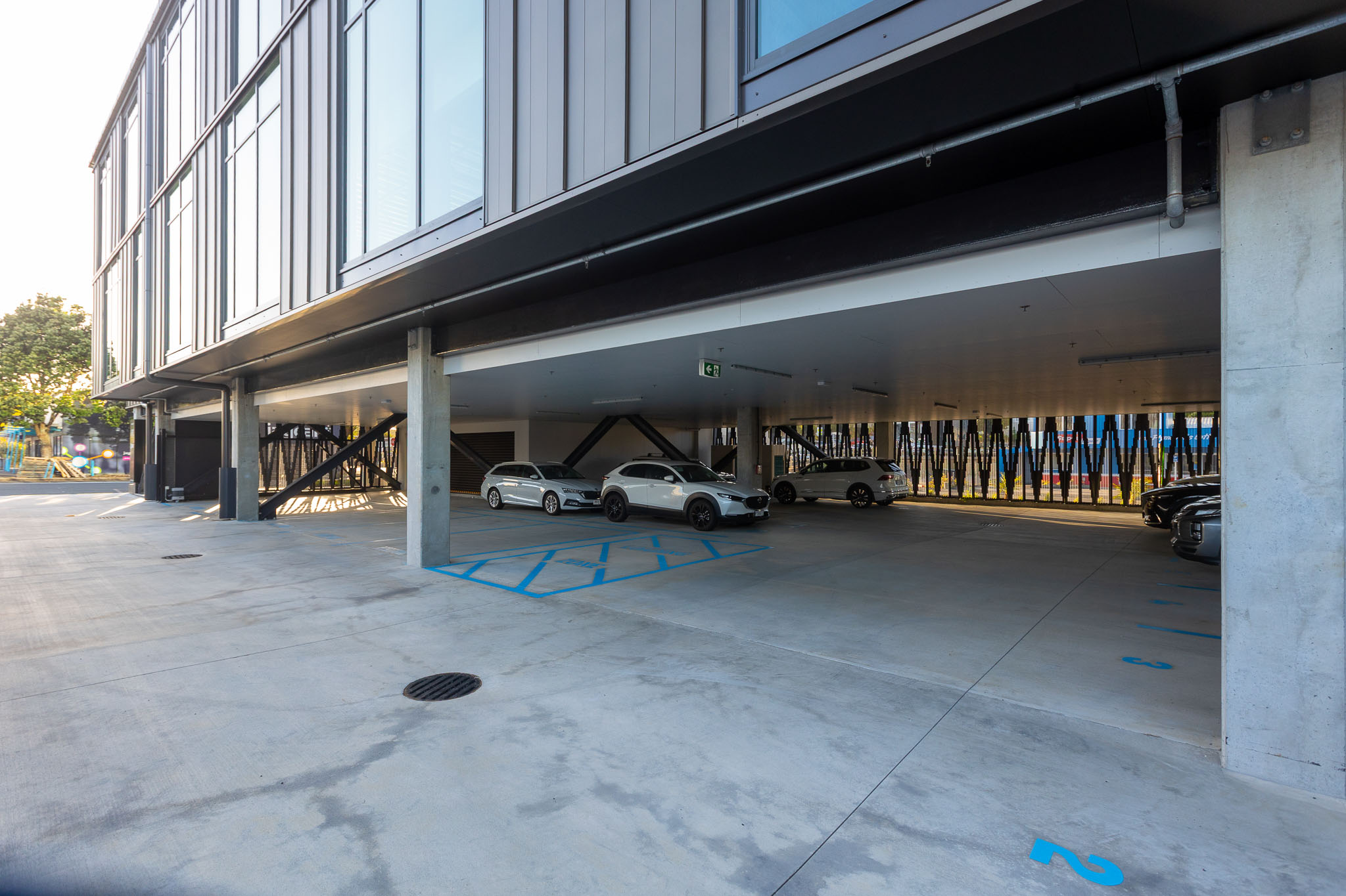 The architectural design features a northeast-facing street entry with ground-level access. It has a strong street presence, with double-height curtain-wall glazing across the two upper floors, positioned to optimise solar gain and reduce reliance on mechanical heating systems. The building services core, including the precast concrete stairs and lift shaft, is effectively located near the main entry for ease of access—while also activating the corner of the site adjacent to a busy one-way arterial traffic route.
