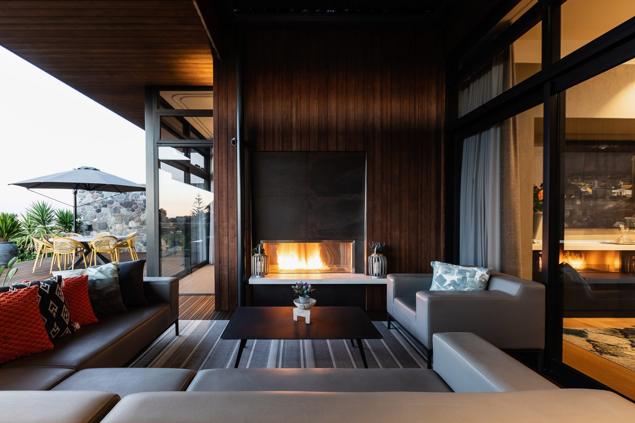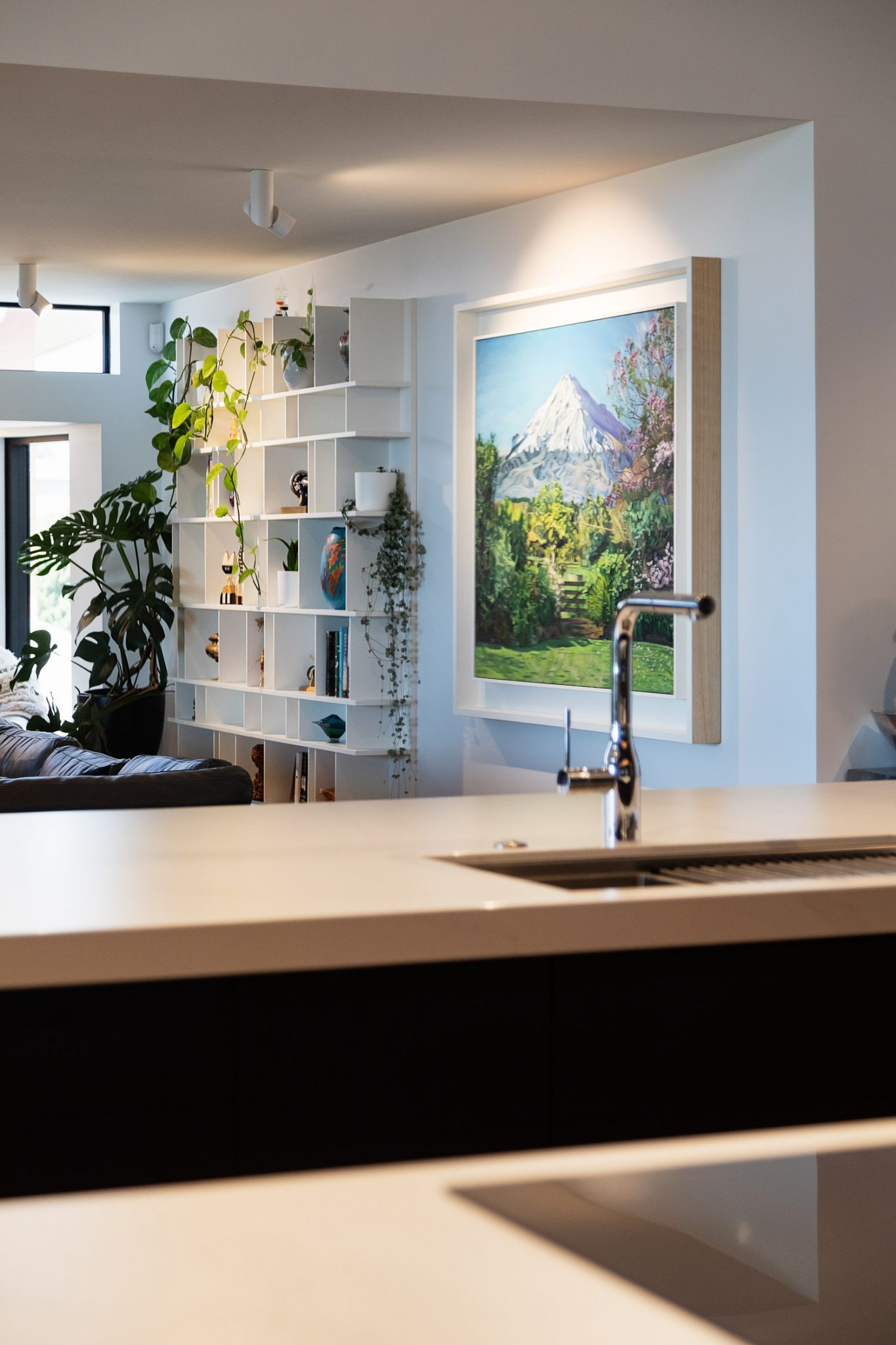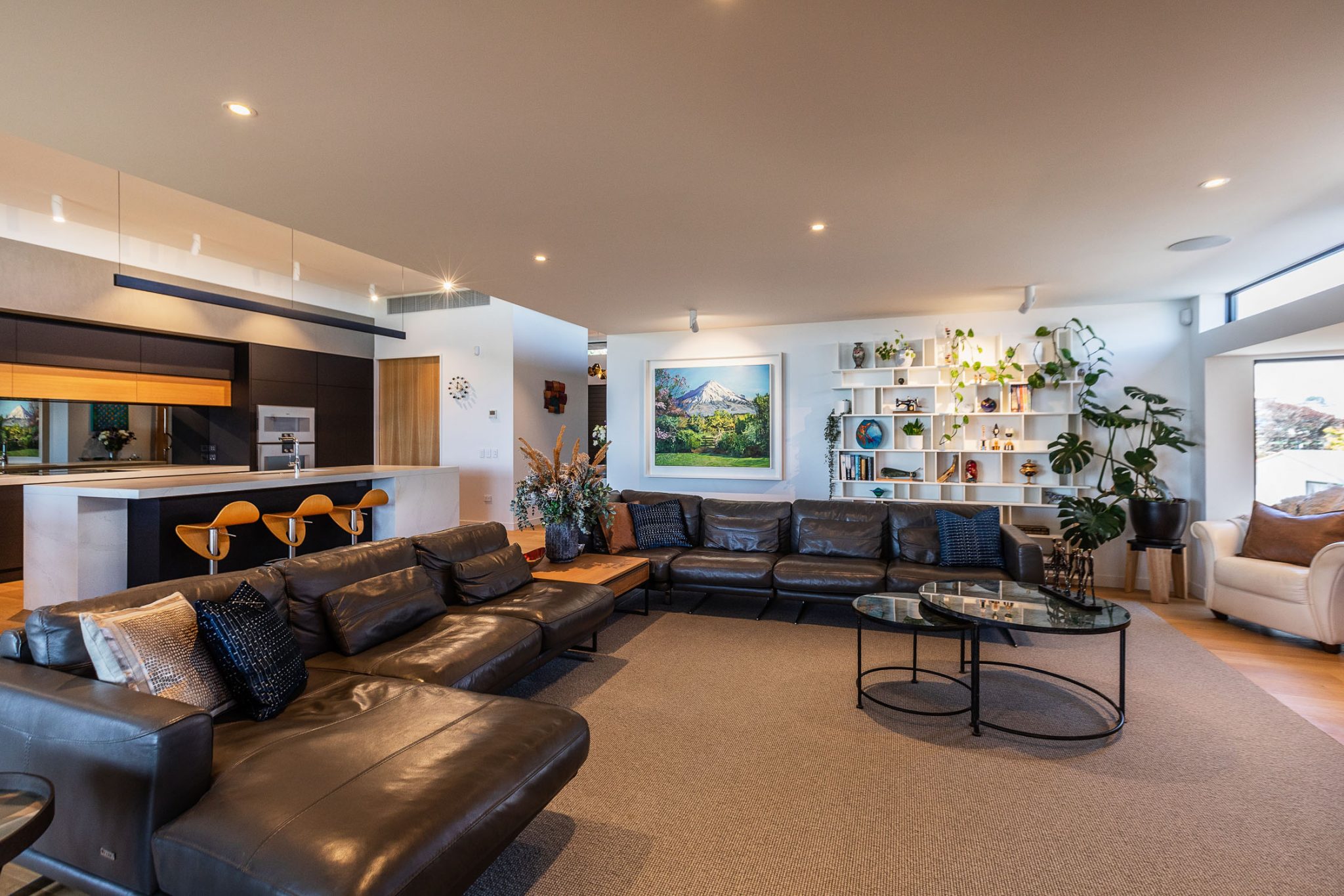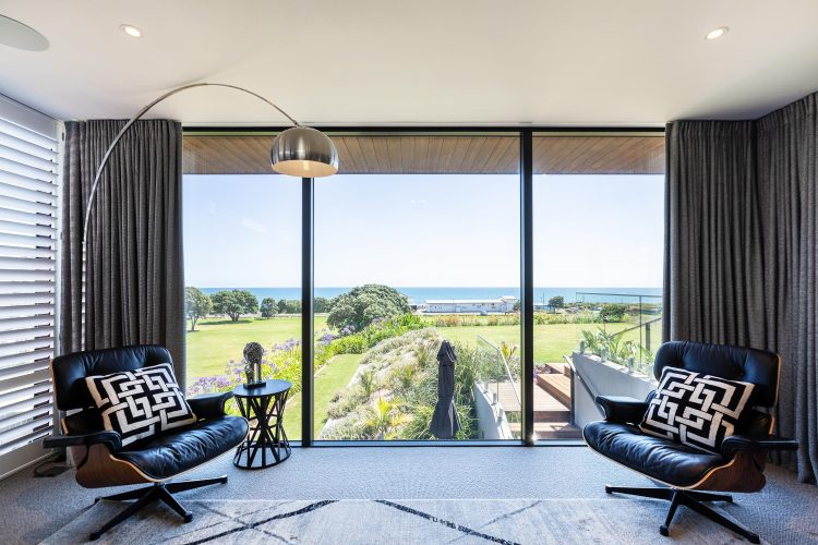 A glimpse of the beautiful Mount Taranaki is captured through a framed window opening. On a clear day, you can be standing on the beach looking back towards the home with the captivating Mountain standing proudly above.