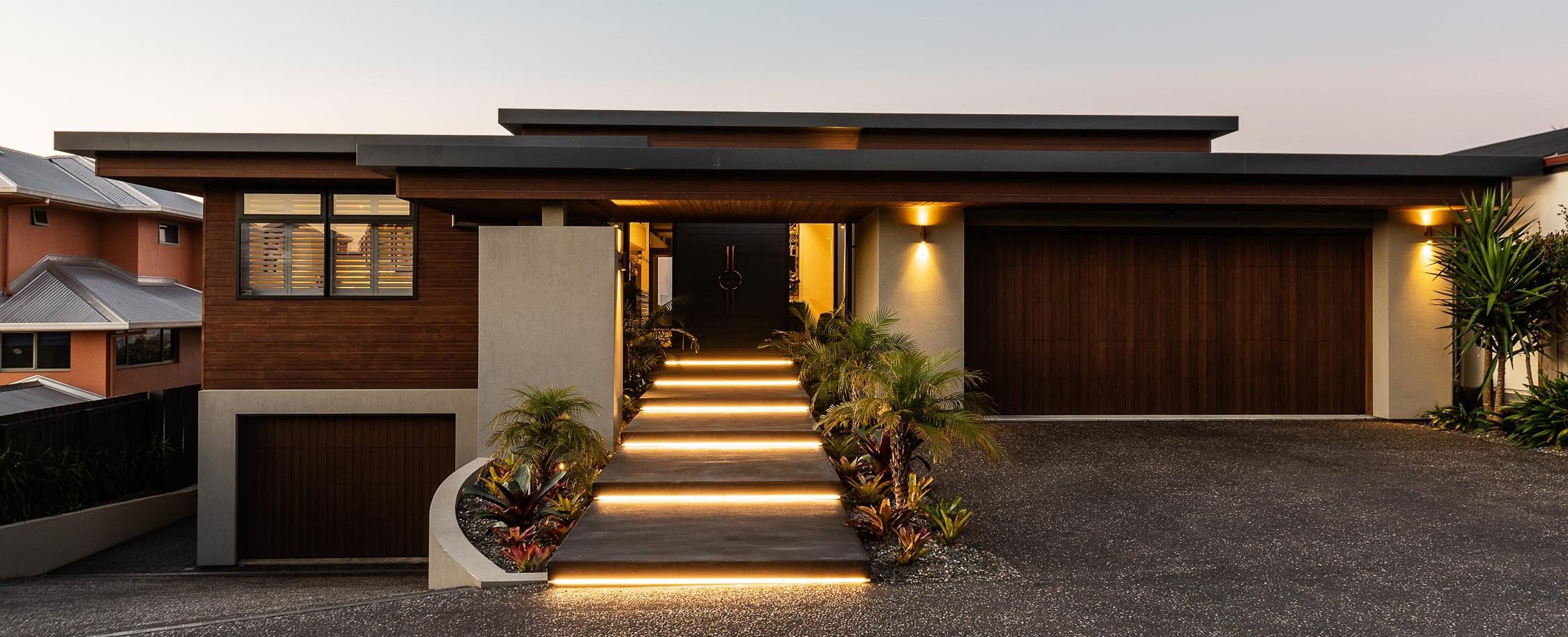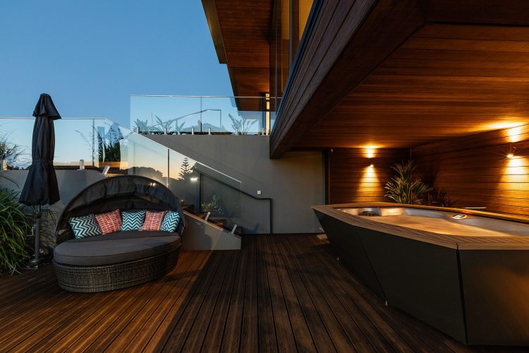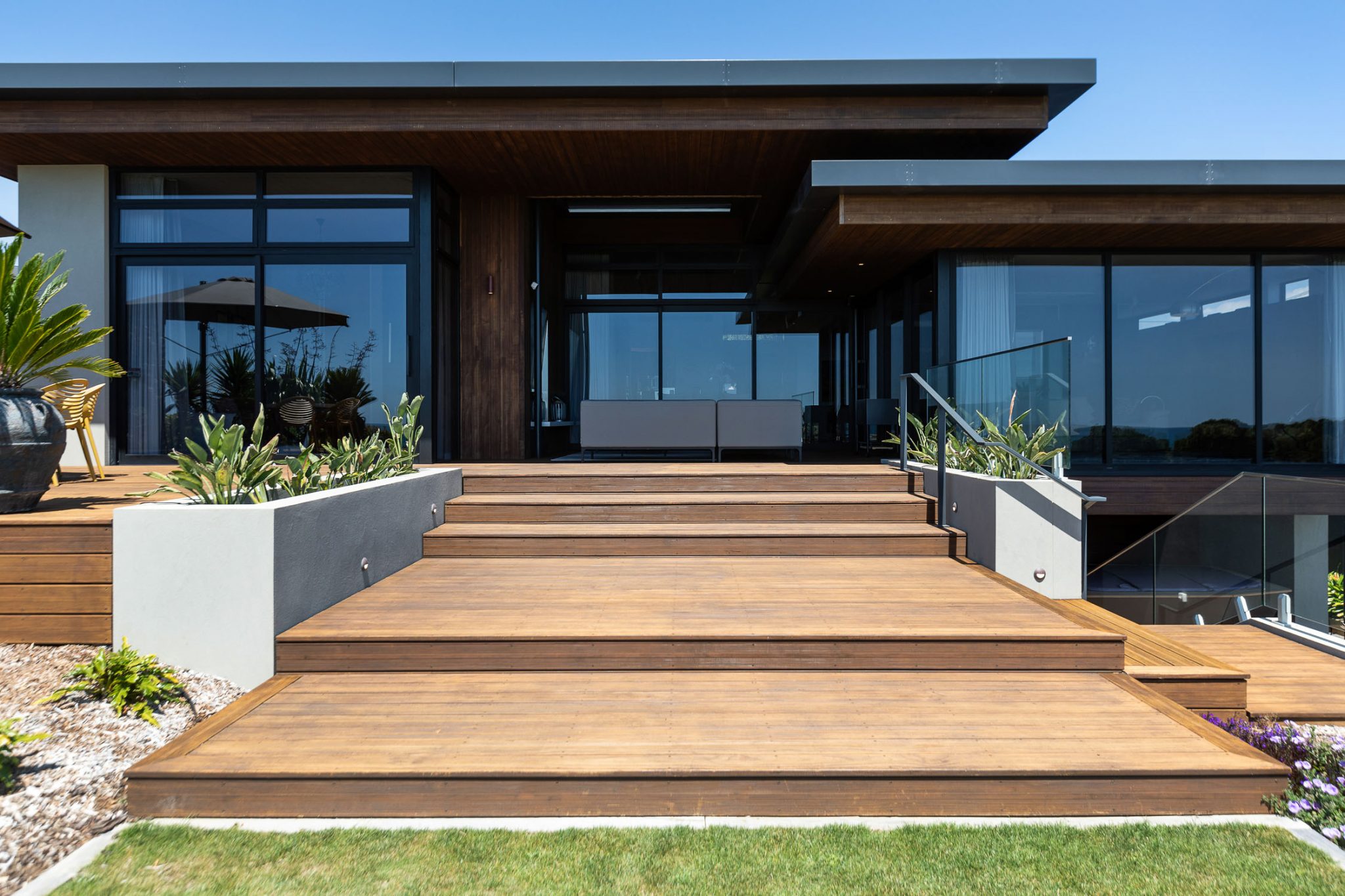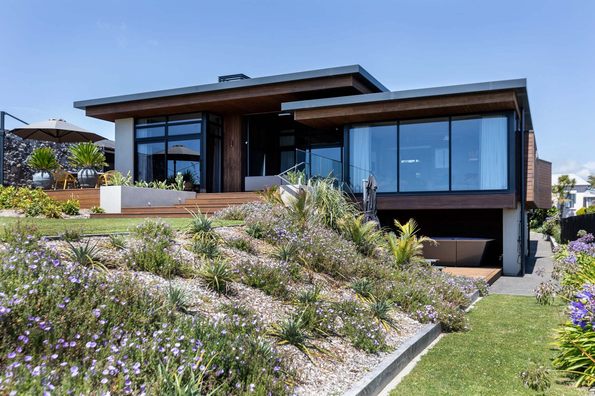 Looking back from Eastend beach is this luxuriously contemporary home sitting on top of its elevated site.