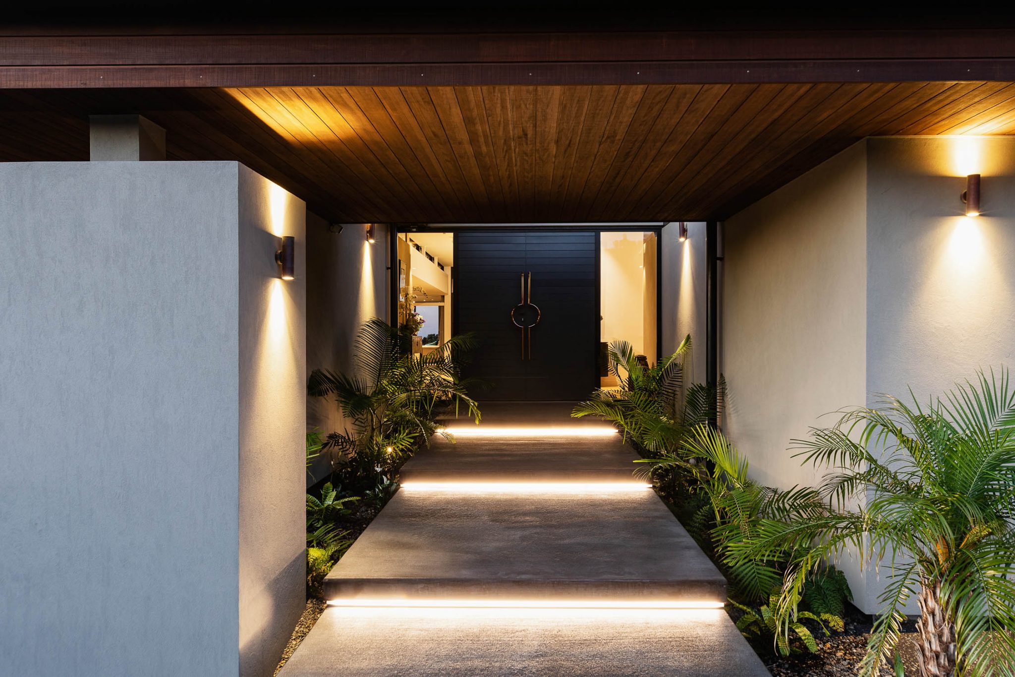 The home’s overlapping roof planes give it a sense that they are floating a-top of the home. The site naturally flows from the street entry down toward the ocean and the palm tree-lined approach allows you to pause for a moment before you turn to the north and the floating pre-cast concrete stair entry.