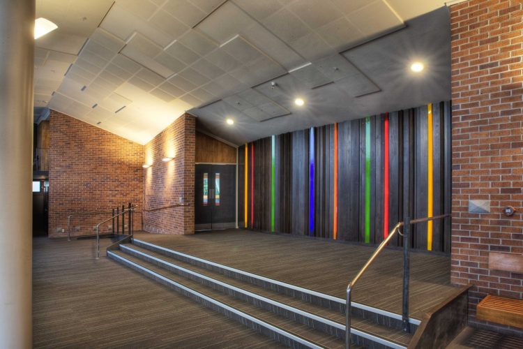 The 2008/2009 renovation of the school hall including redevelopment of the foyer, building exterior and an upgrade of stage engineering. The school hall, well designed in its day was in need of a makeover, but also needed to become a flexible multi use building. Careful re planning allowed space for a kitchen and additional storage. Accessibility issues were addressed and new seating installed.