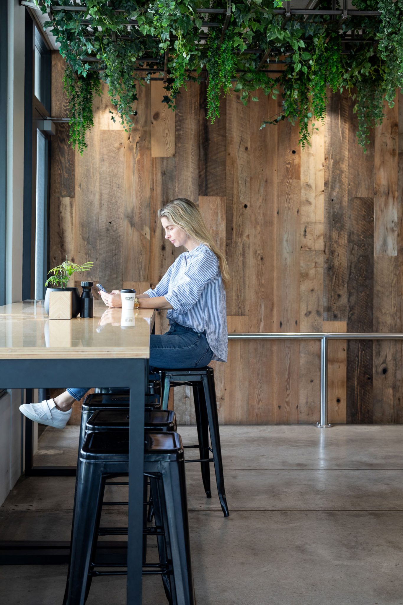 The stickman café is a simple space maximizing natural light through the existing window joinery to the west. The café has been given a natural sense of calm through the rough-sawn timber feature wall and use of greenery, albeit artificial for ease of maintenance.