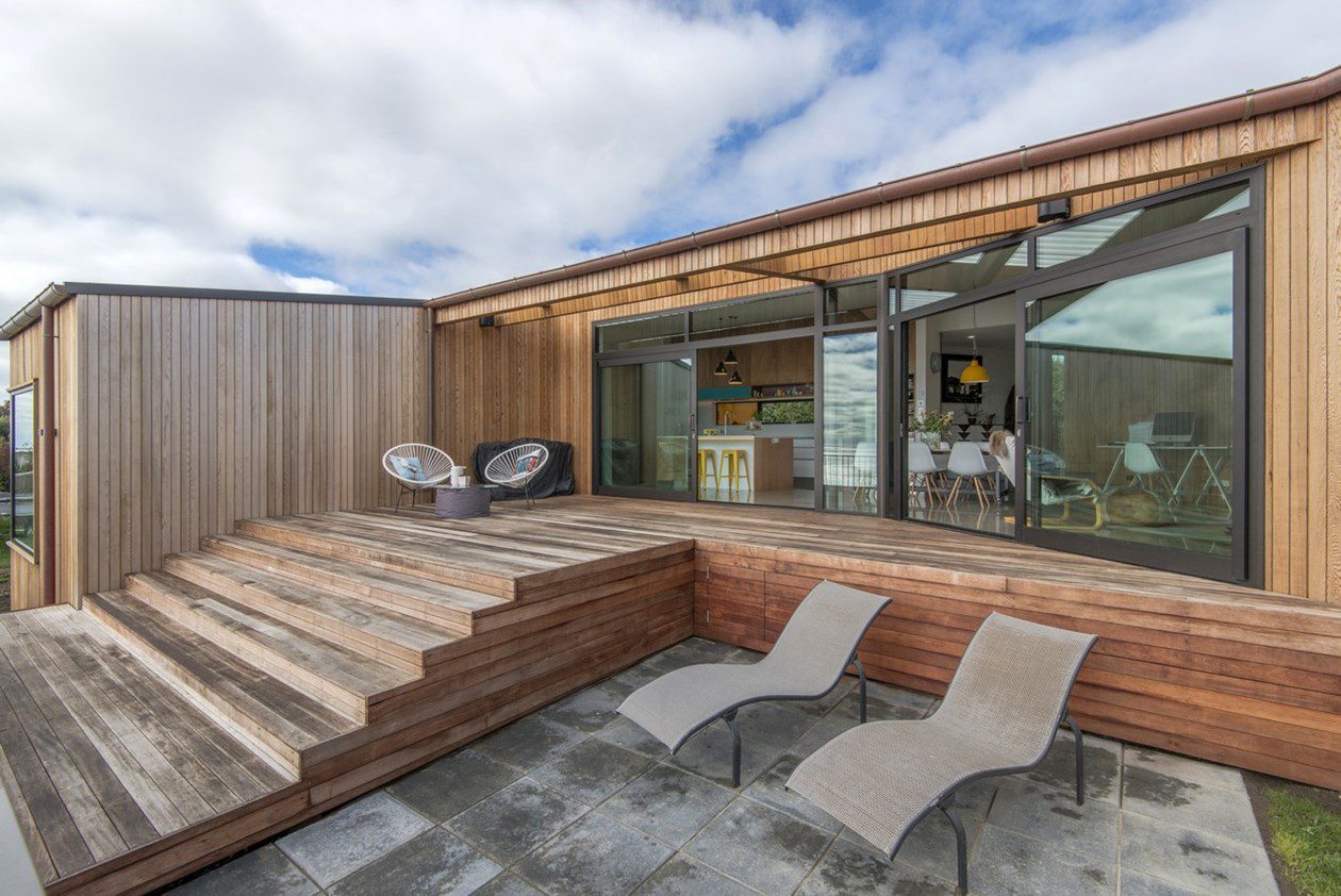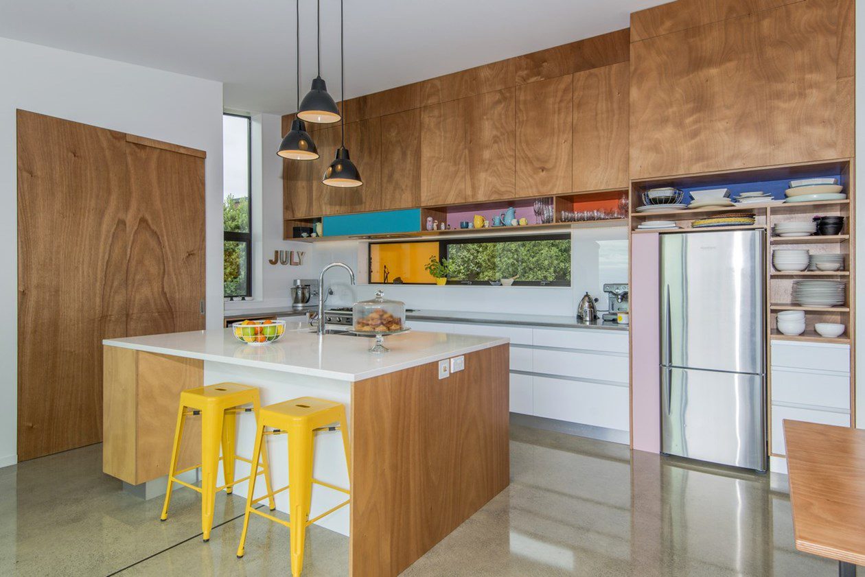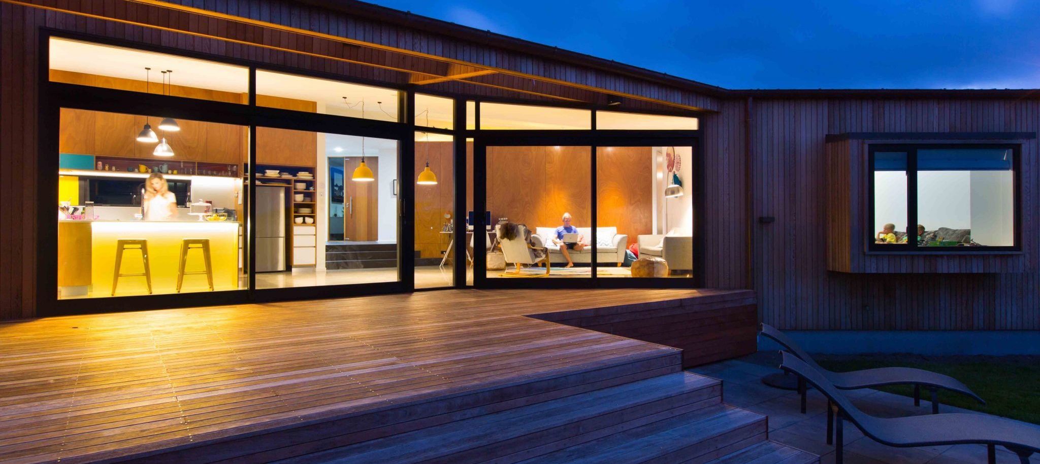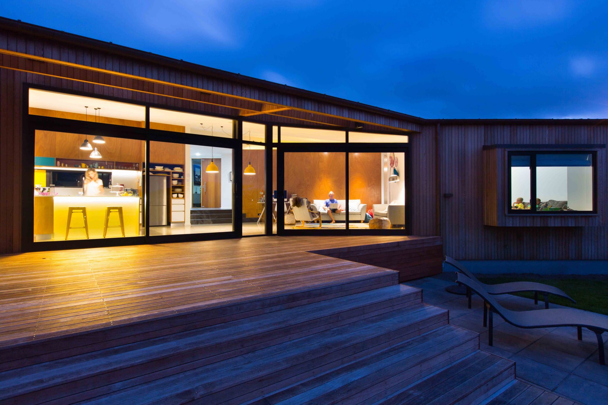 Sheltered areas provide outdoor living spaces that can be enjoyed year round. Inside a series of intimate private spaces unfold into the into the heart of the home – the wide-open family and entertaining area. Cosy and inviting, a centrally placed floating plywood wall provides a backdrop for open-plan living on one side and bedroom wing on the other. This creates both privacy, a visual hearth and connection with the landscape.