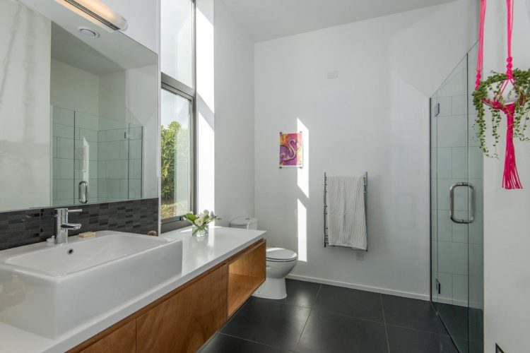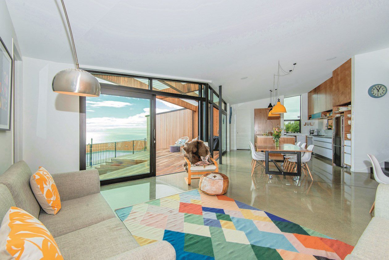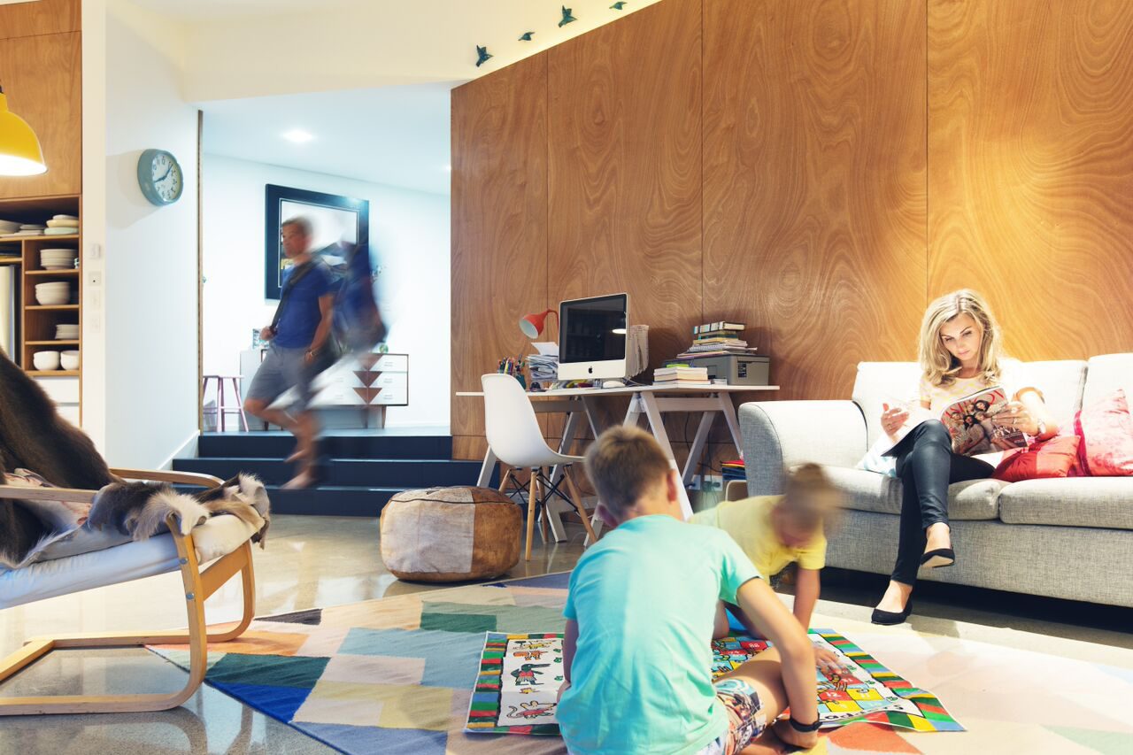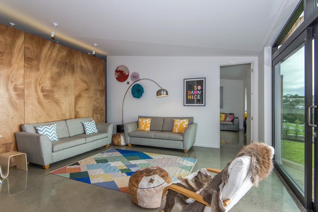 Sheltered areas provide outdoor living spaces that can be enjoyed year round. Inside a series of intimate private spaces unfold into the into the heart of the home – the wide-open family and entertaining area. Cosy and inviting, a centrally placed floating plywood wall provides a backdrop for open-plan living on one side and bedroom wing on the other. This creates both privacy, a visual hearth and connection with the landscape.