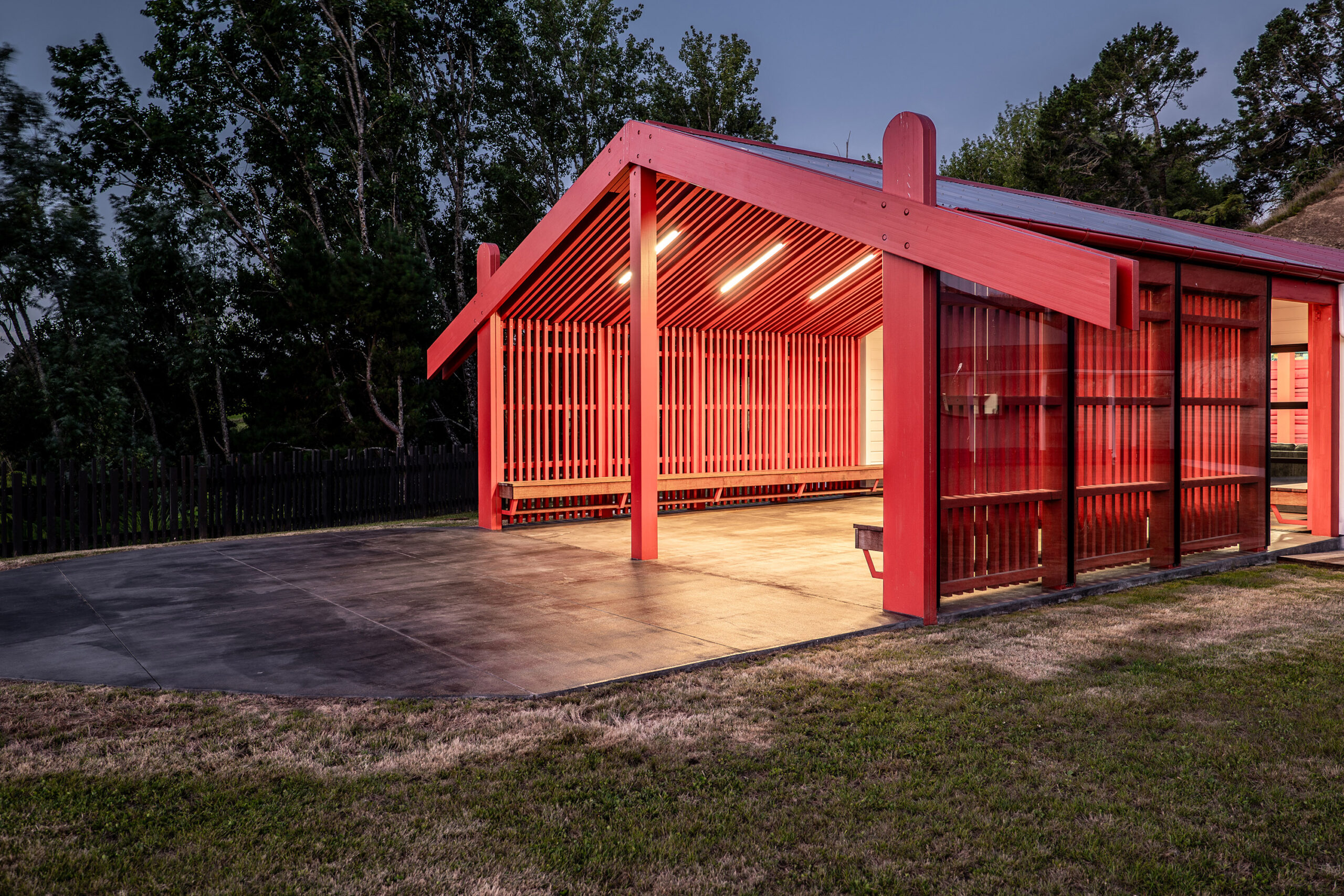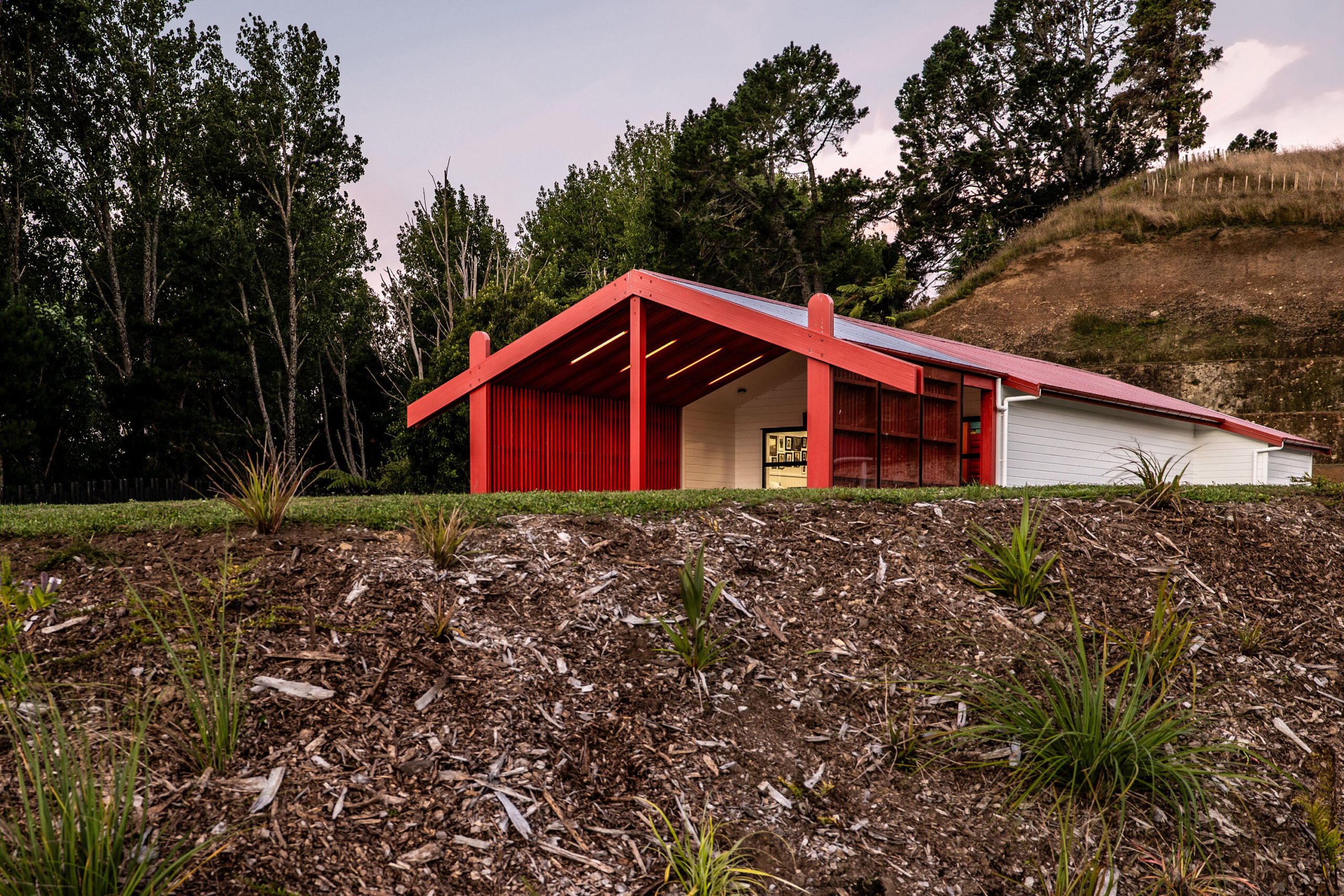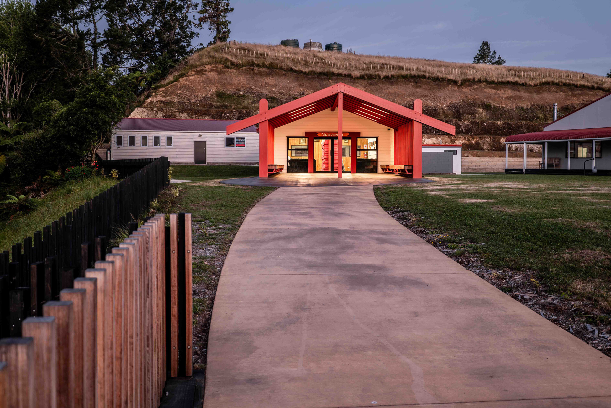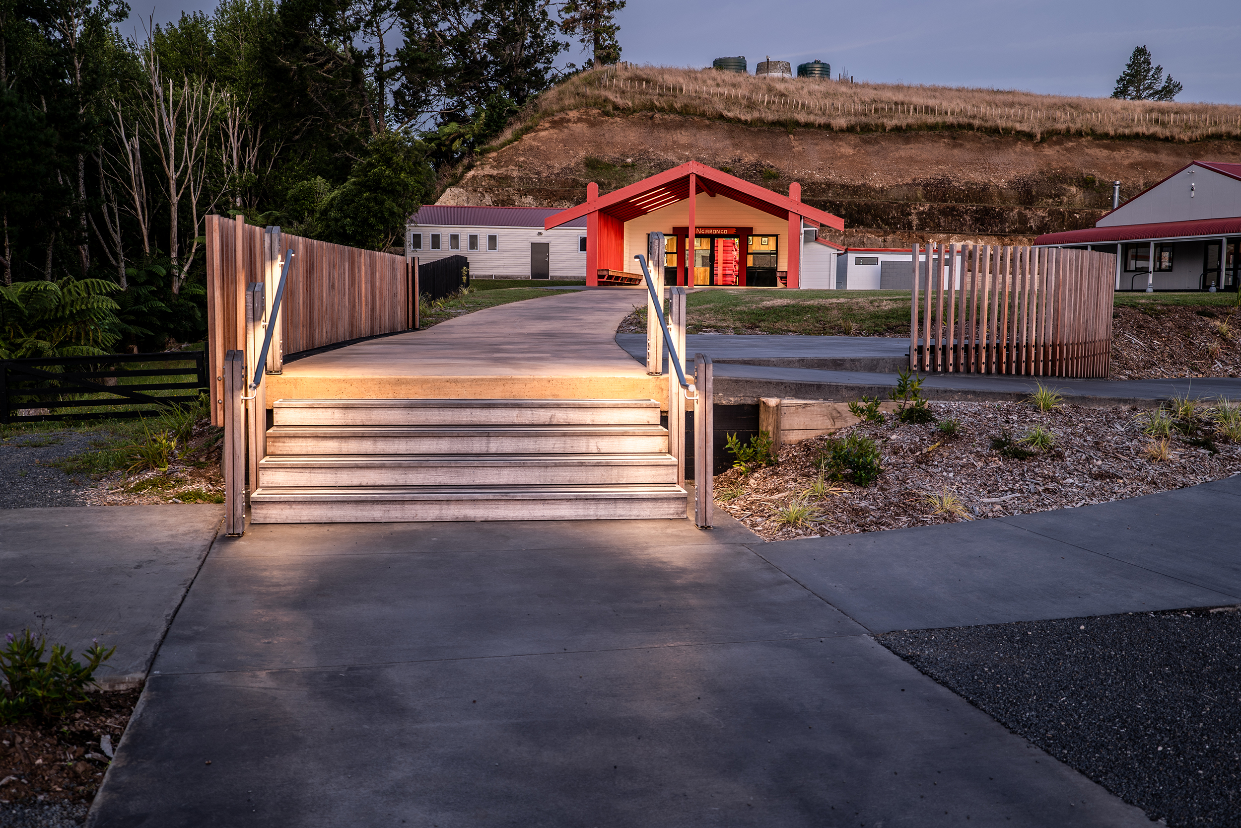 Te Upoko O Te Whenua Marae is the only remaining Marae within Ngati Maru district and iwi boundary. The Marae sits on 17.4 hectares of Reservation land and the Waitara awa boarders the site. A large hill to the north east of the marae was restricting light and a terraced landscape solution was decided upon to address daylighting of the space.