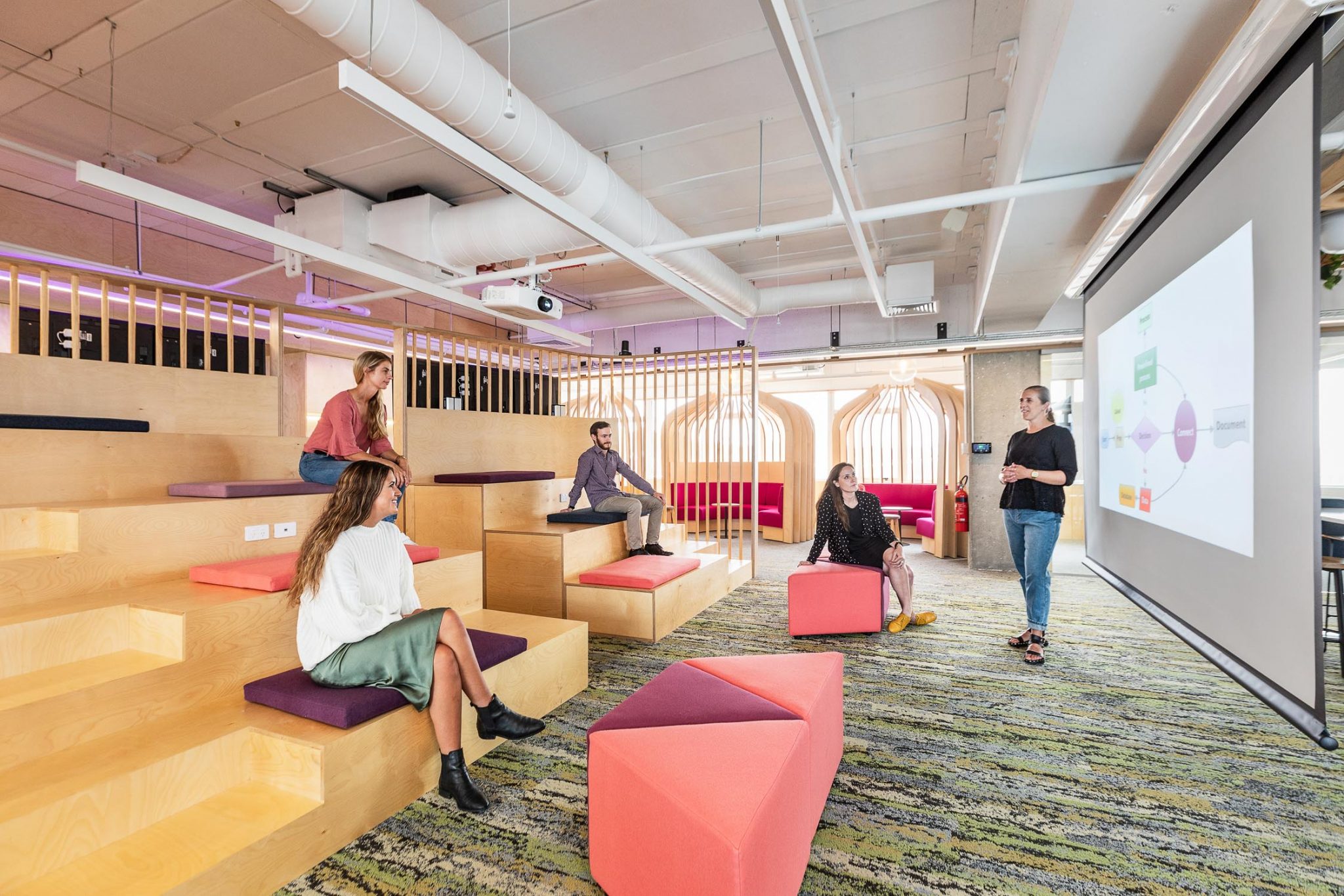 This space has been completely striped back and no longer consists of solid walls and doors creating barriers to staff connection. The new space allows for optimal flexibility and supports connection, innovation and progression.