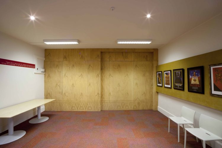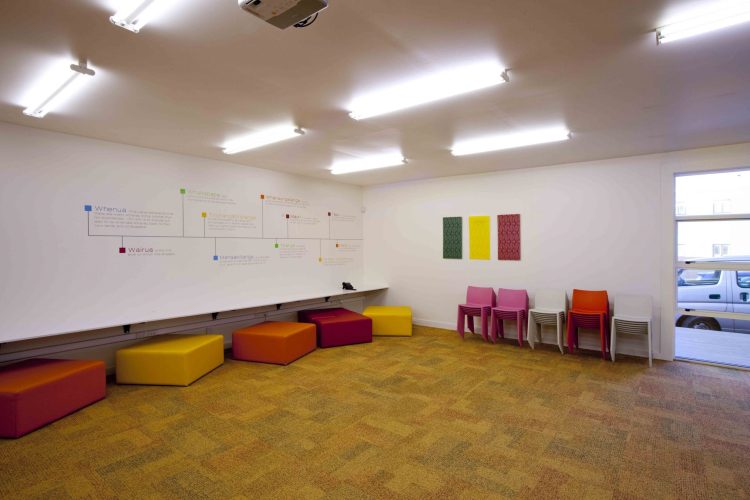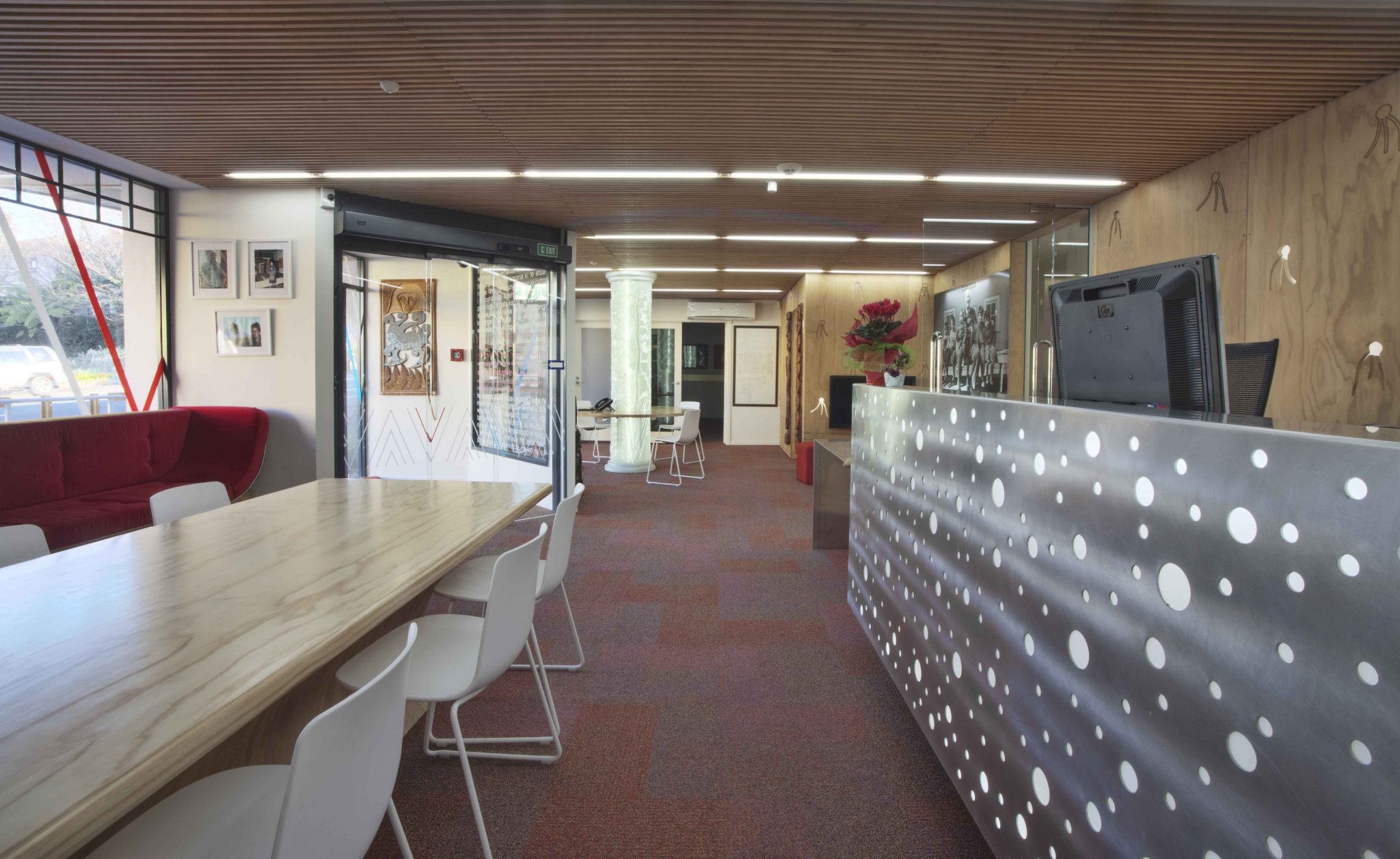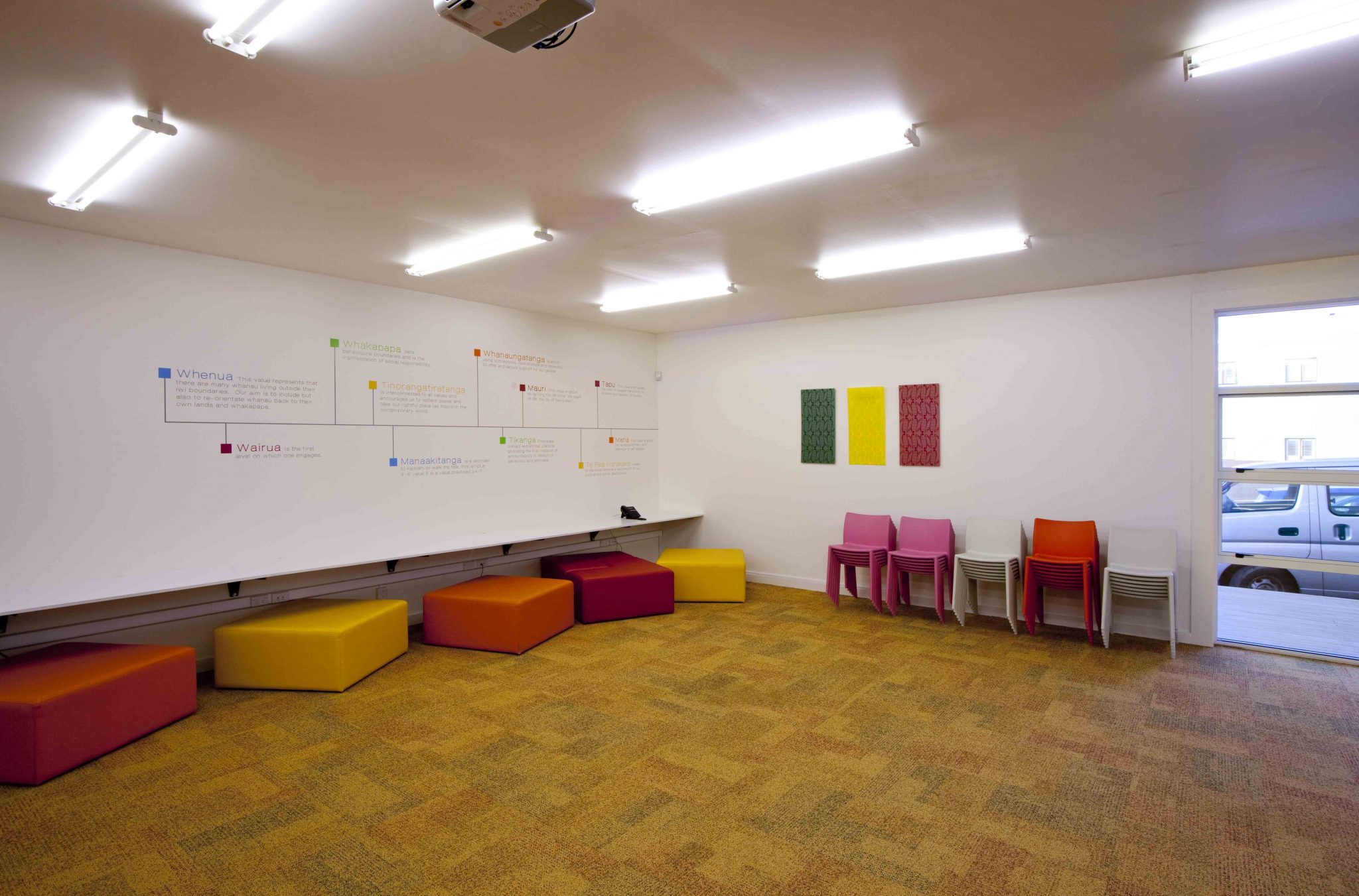 The vibrant interior solution has been developed to enhance the organisation’s core beliefs. Timber interior finishes to both walls and ceilings create a warm, rich atmosphere which clearly references the cultural background of Tu Tāma Wāhine o Taranaki.