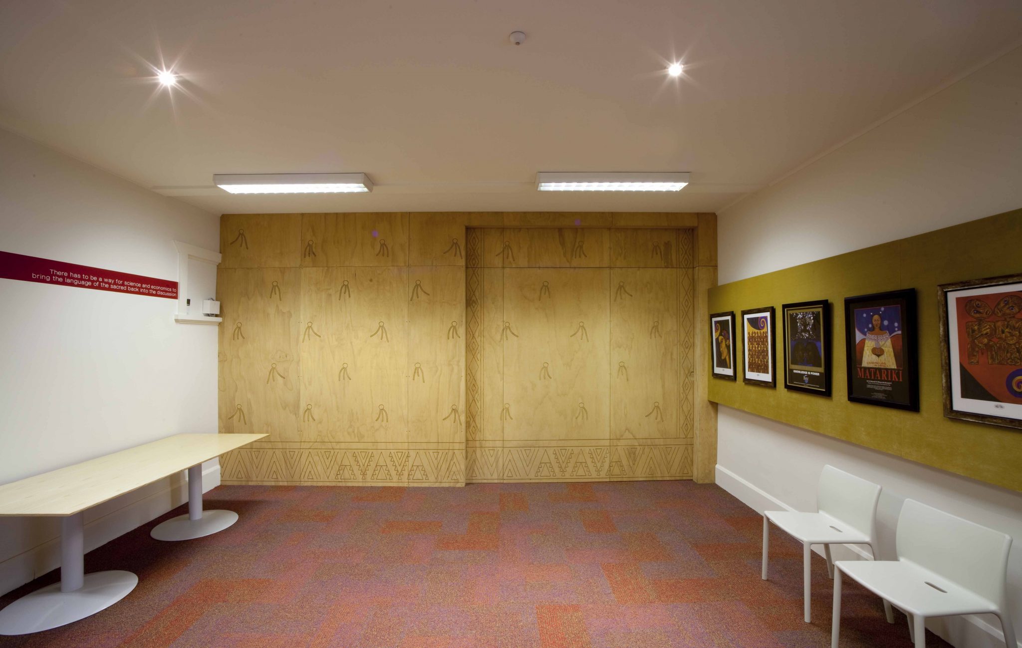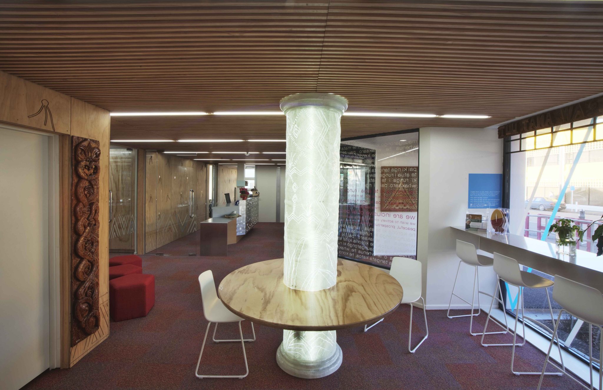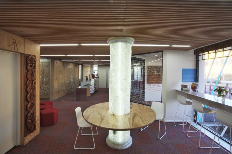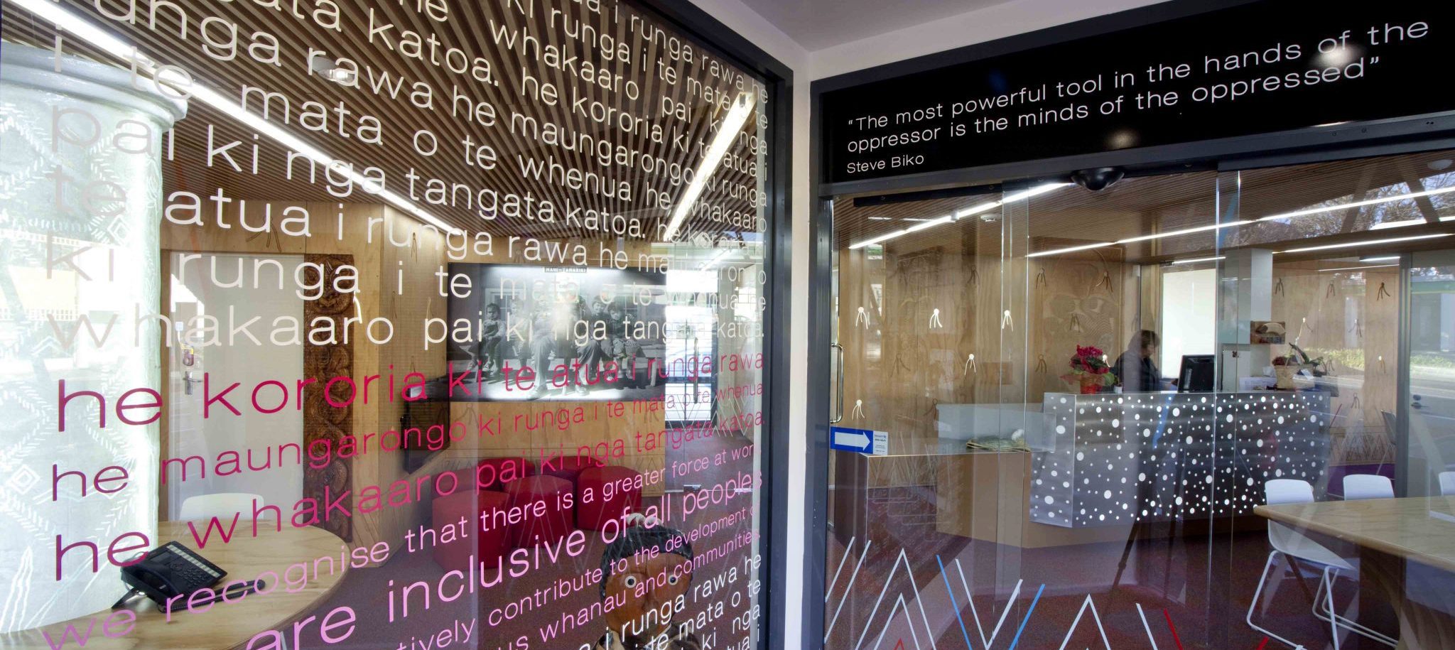 The vibrant interior solution has been developed to enhance the organisation’s core beliefs. Timber interior finishes to both walls and ceilings create a warm, rich atmosphere which clearly references the cultural background of Tu Tāma Wāhine o Taranaki.