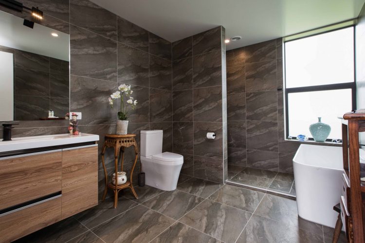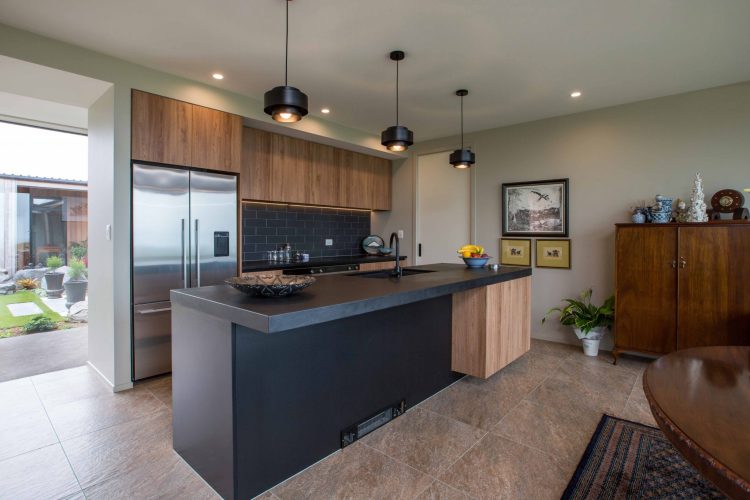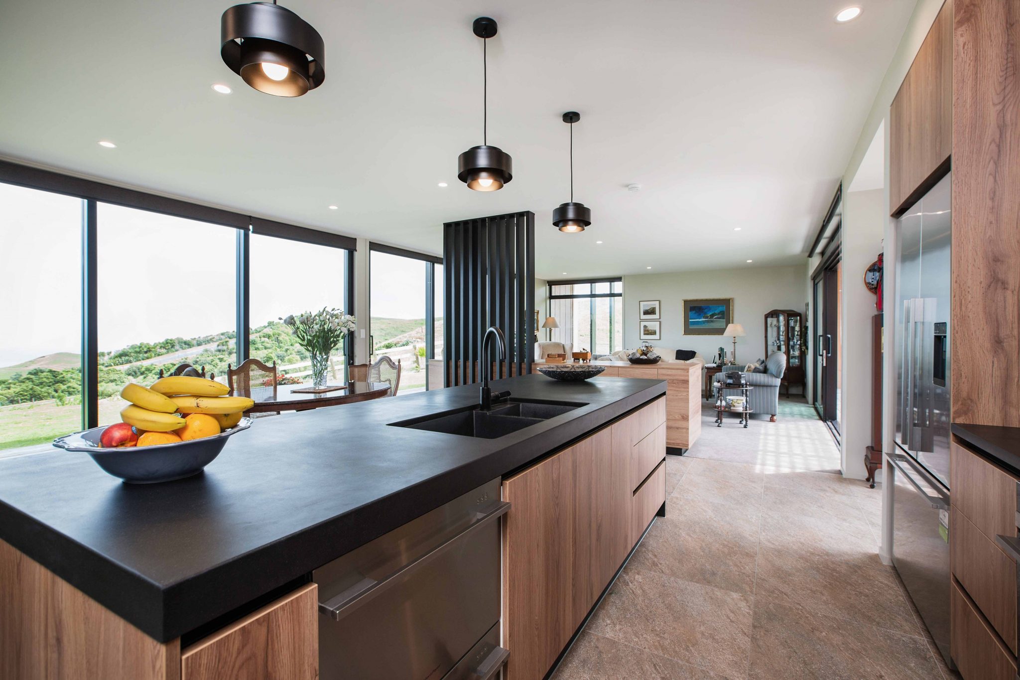 Glass walls surround the sides of the kitchen, dining and lounge with an open plan layout which incorporates a custom built open joinery unit.