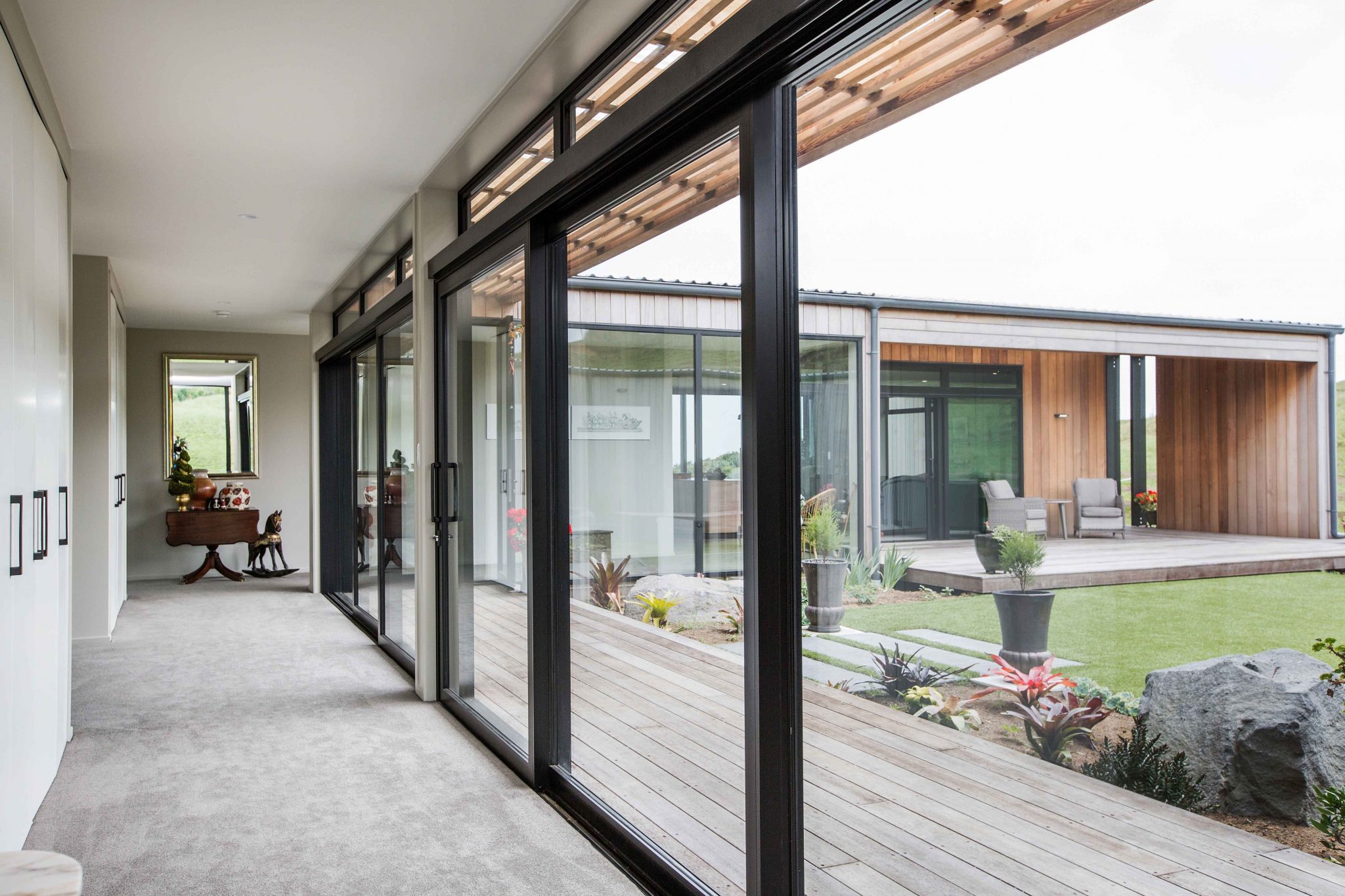 This unit provided the separation the clients wanted between the lounge and dining area without closing off the space. A glass hallway leads from the entrance to the lounge and links the three bedrooms and lounge to the courtyard on the other side.