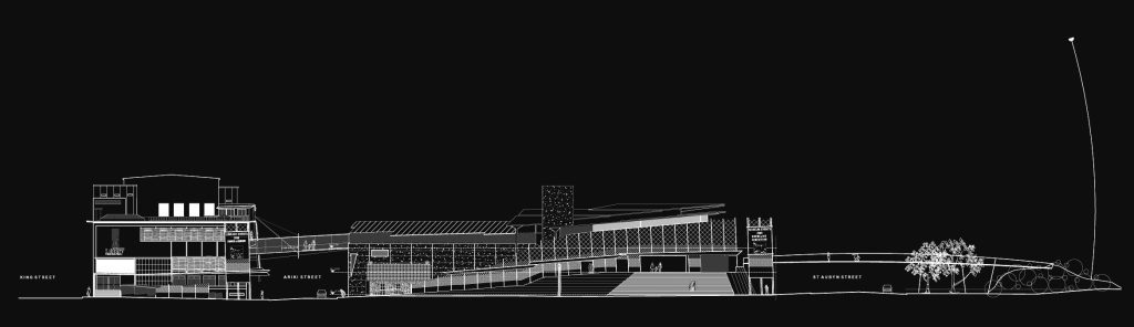 What could that mean? In a proposed design, Puke Ariki connected both city and sea, stretching from the library and research centre to a sky bridge which touched down onto the walkway. Although this was not completed in its initial construction, Goldsmith jokes he still has all the measurements and drawings and would love for someone to take the idea and run with it.