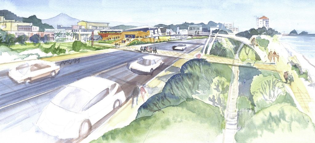 An original water painting envisioning the connection between Puke Ariki and the foreshore.